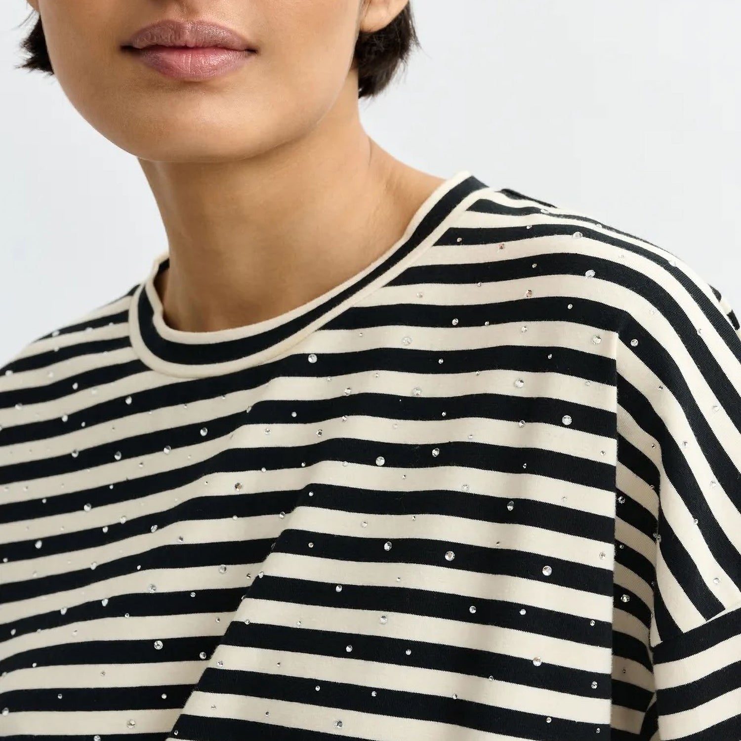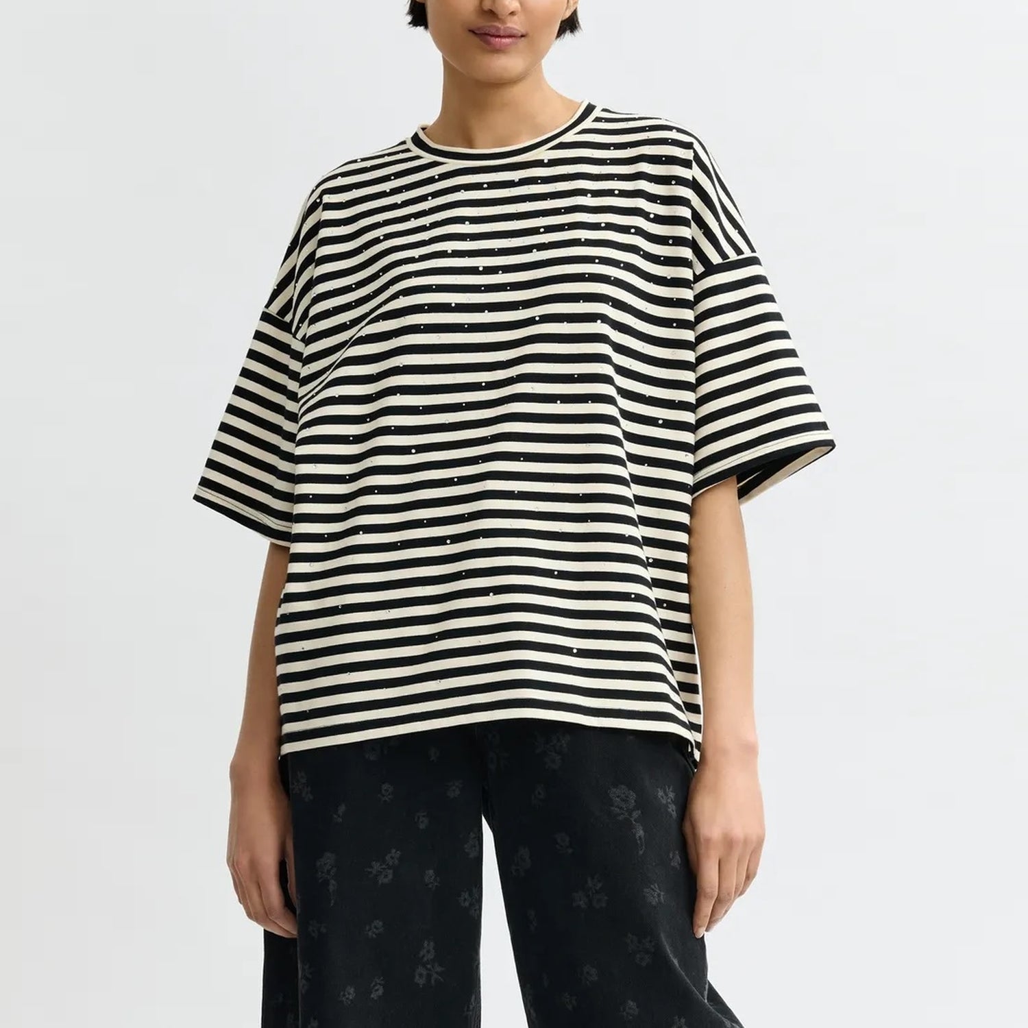 We all love a stripe. Cotton T-shirt is cut for a boxy, oversized silhouette, featuring short sleeves and a clean round neckline. Crafted in a striped two-colour design with rhinestones scattered all over. Wear it tucked into tailored pants or let it elevate your go-to denim.