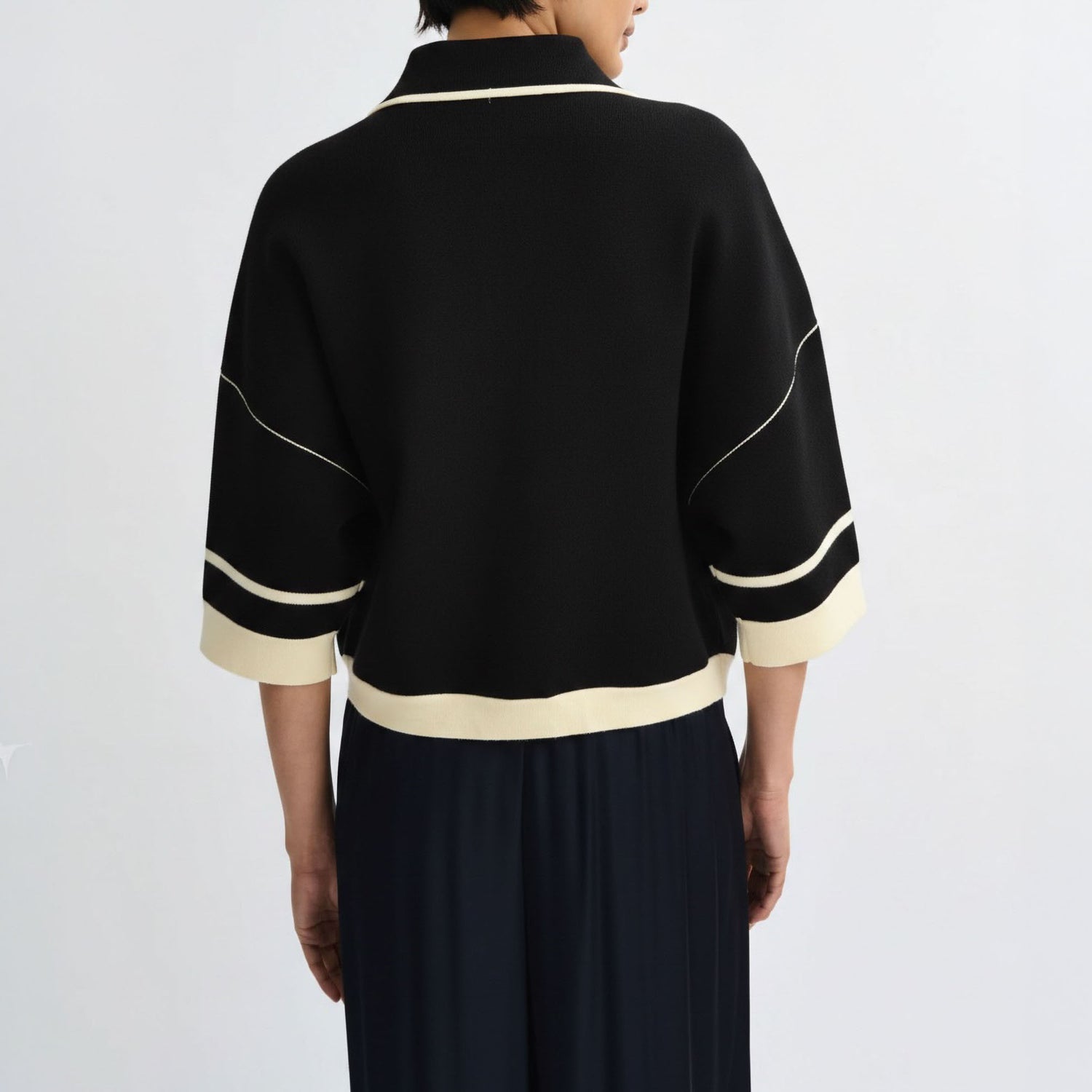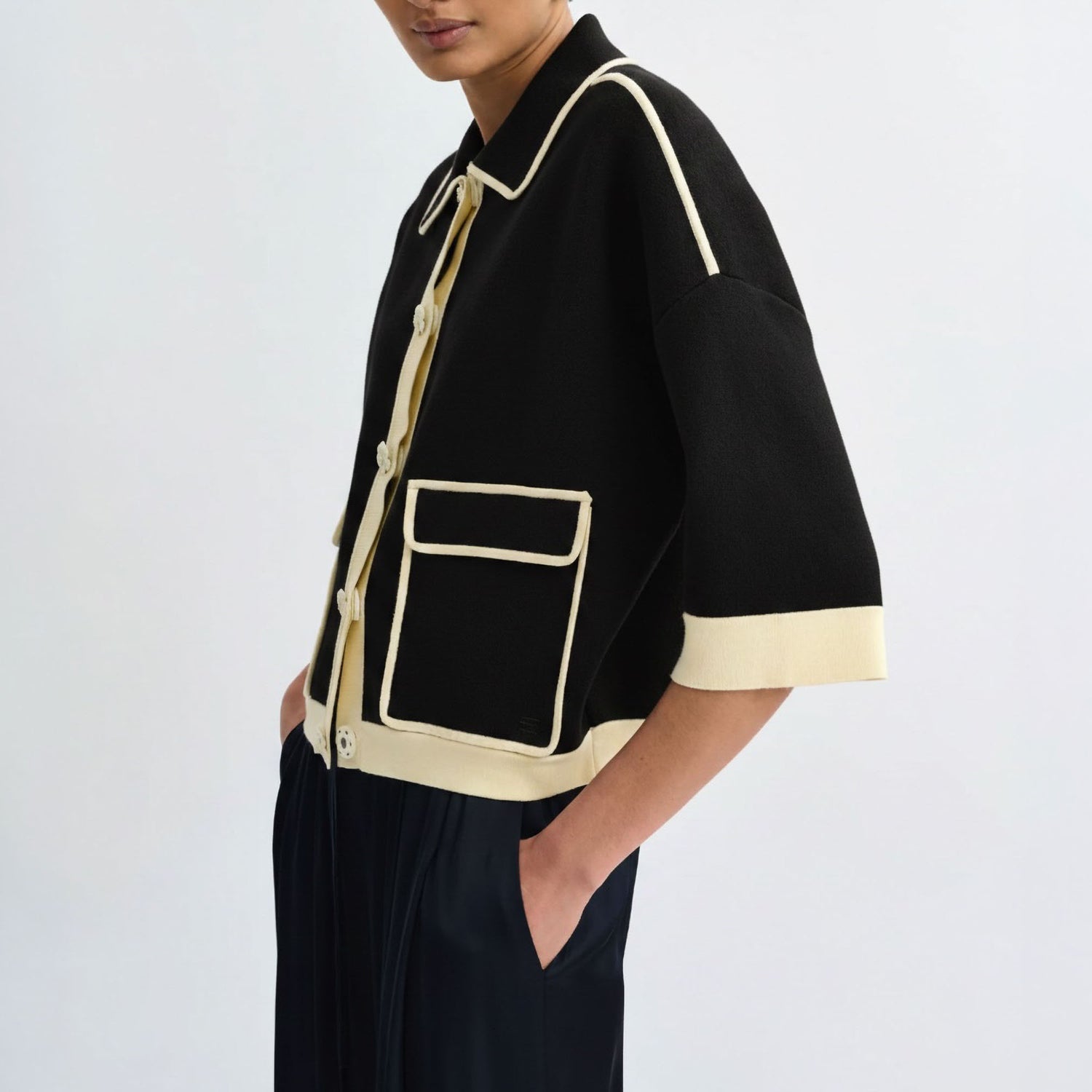This Essentiel Antwerp cardigan is crafted from a fine knit containing recycled polyester for lightweight comfort. Designed for a relaxed fit, it features charming flower snap buttons and bold contrast trim for a playful touch. Finished with flap pockets and cropped 3/4 sleeves. Easy to layer, effortless to wear.