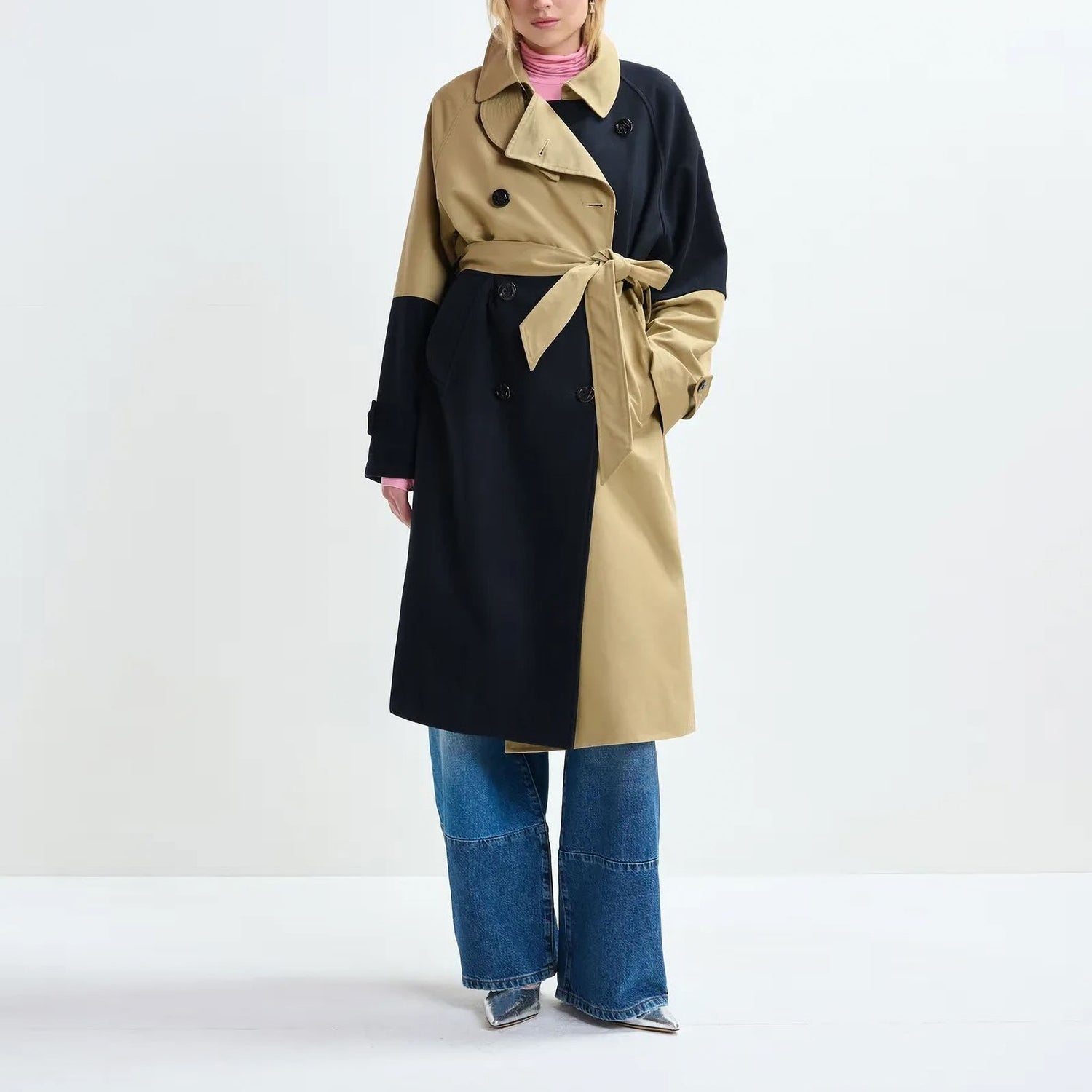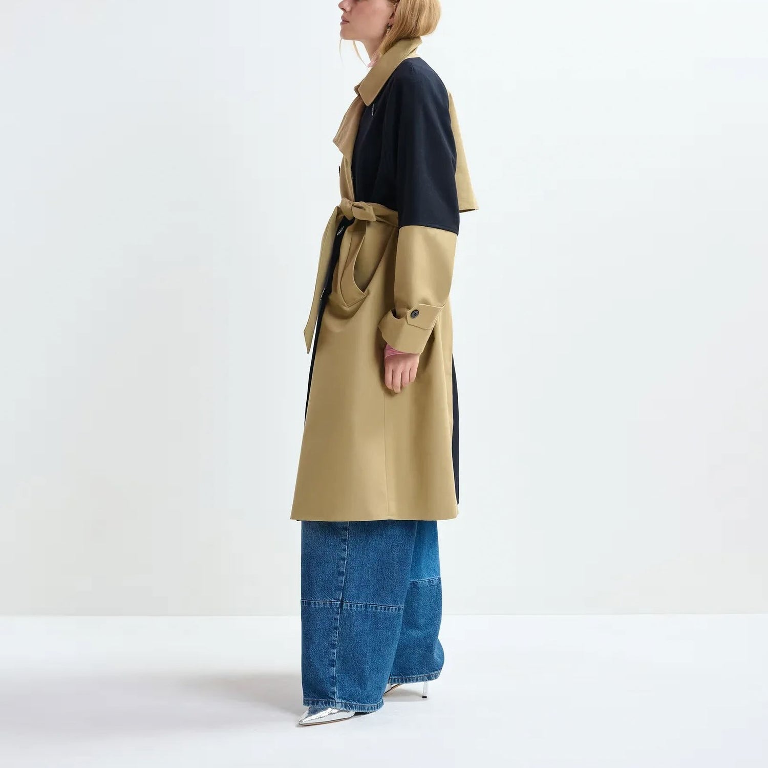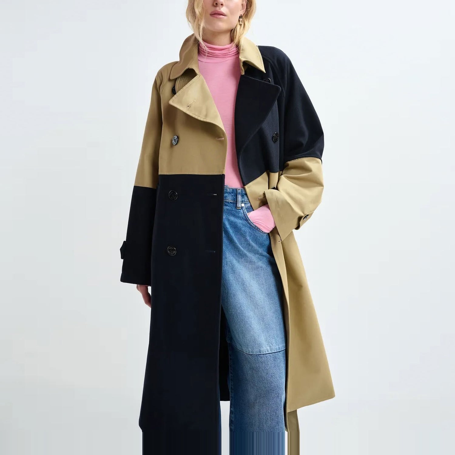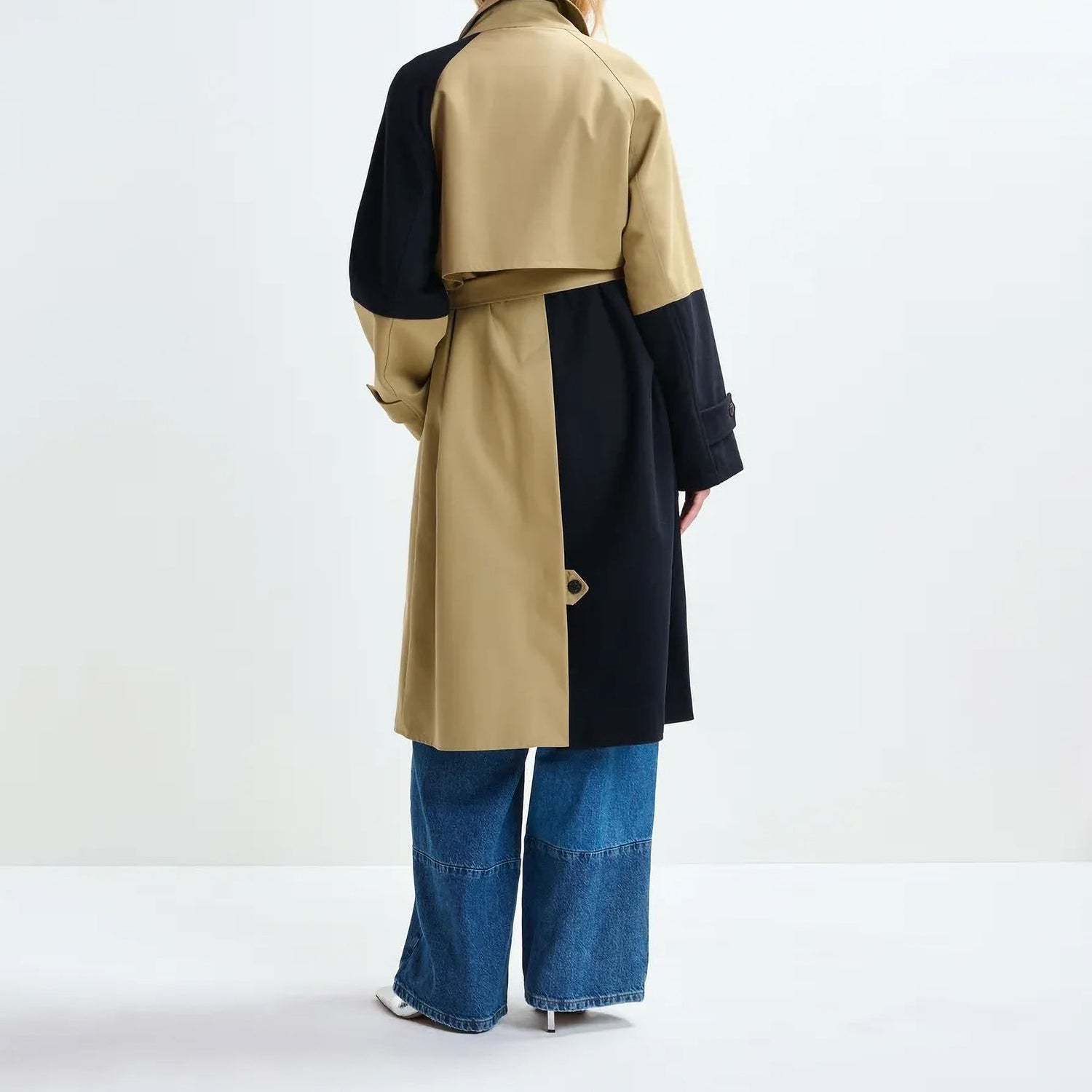 This colour-block trench blends classic tones with a modern edge. Crafted from a cotton blend, it’s cut for a relaxed fit that layers with ease. The double-breasted design is finished with coated marine buttons, a self-tie belt, and belt loops to define the waist. Sleek touches such as slanted pockets, a storm flap, buttoned cuffs, and a topstitched collar flap with a belt buckle add subtle attitude, while a hook-and-eye closure at the collar completes the look.