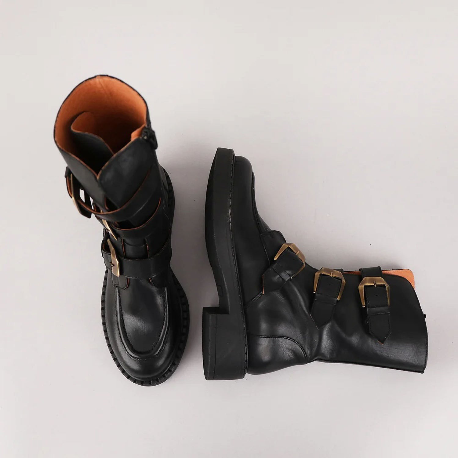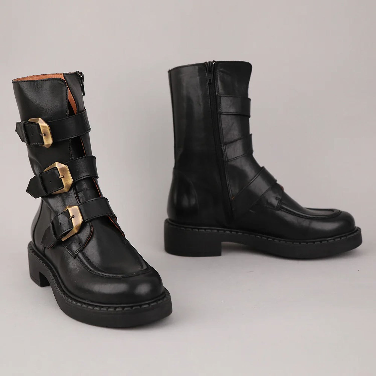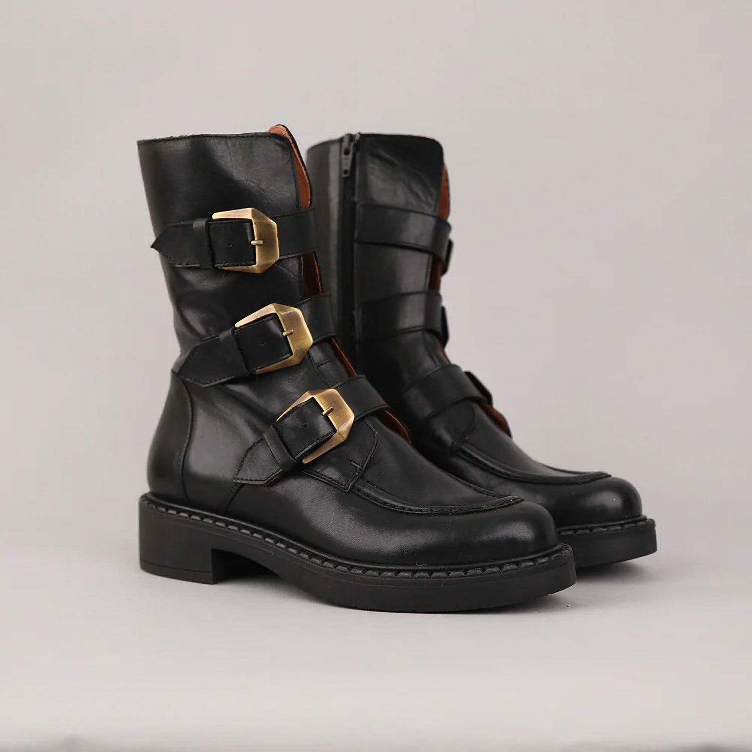 Make a statement with the Birdie Black tall ankle boots, designed with three chunky vintage buckles for a bold, playful edge. Made from soft leather, these boots offer a striking look without sacrificing comfort. The convenient inside zip ensures easy on-and-off, making them the perfect finishing touch to any outfit.