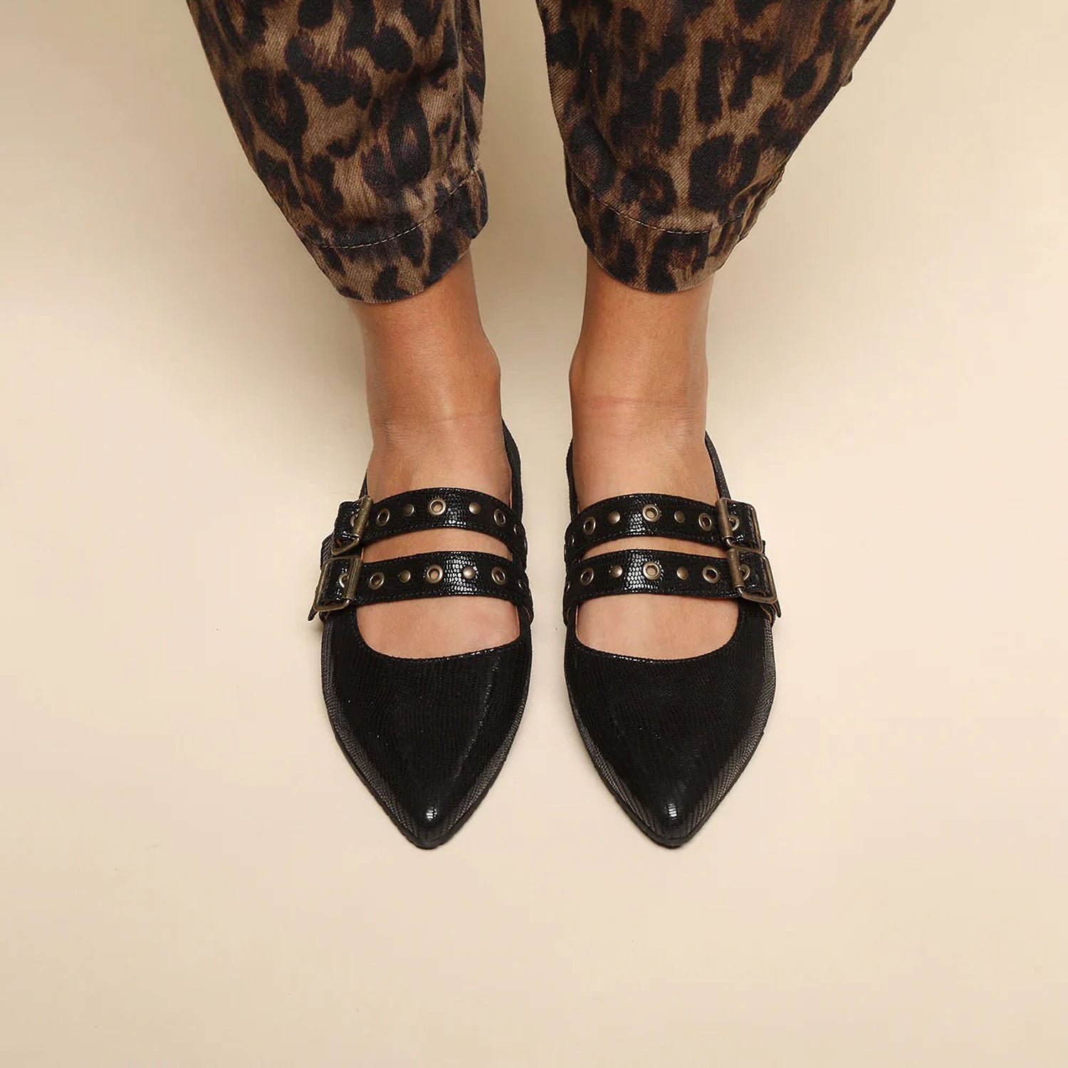 The Harper Metallic Black adds a vibrant touch with its eye-catching metallic black fabric and closed-back style. Designed with adjustable chunky double straps, it provides a secure fit for high arches, while the pointed toe creates a sleek and fashionable look. Perfect for those who love bold, trend-forward footwear with a fun, playful vibe.