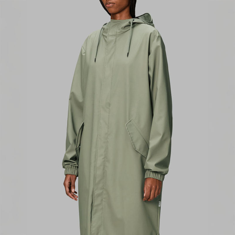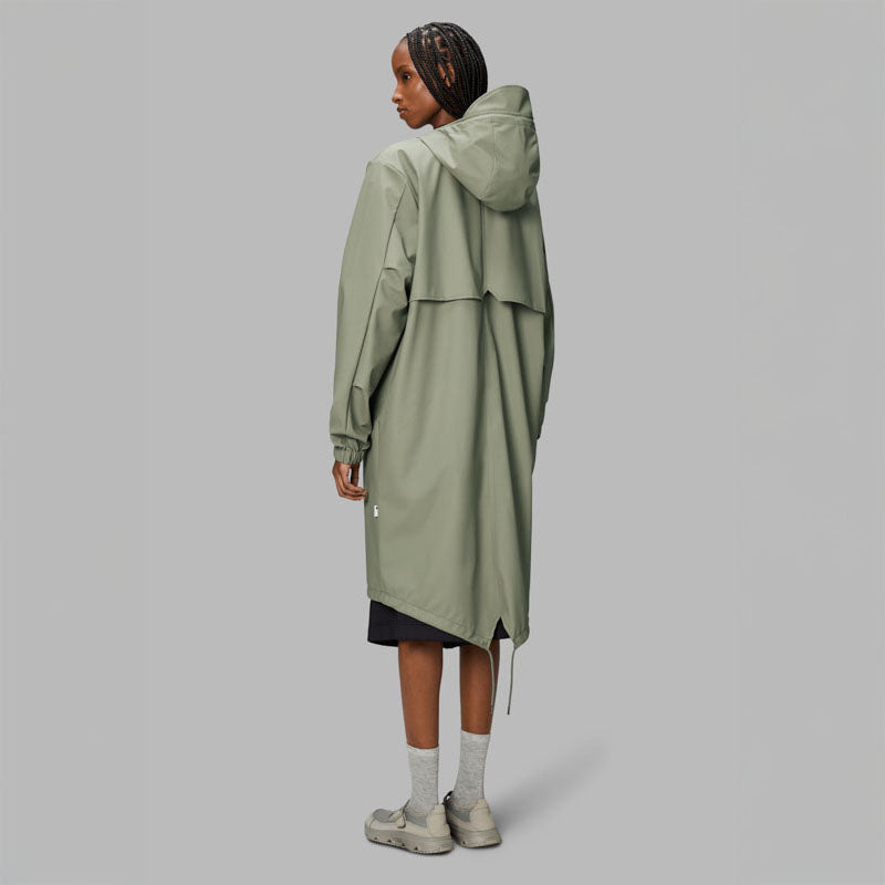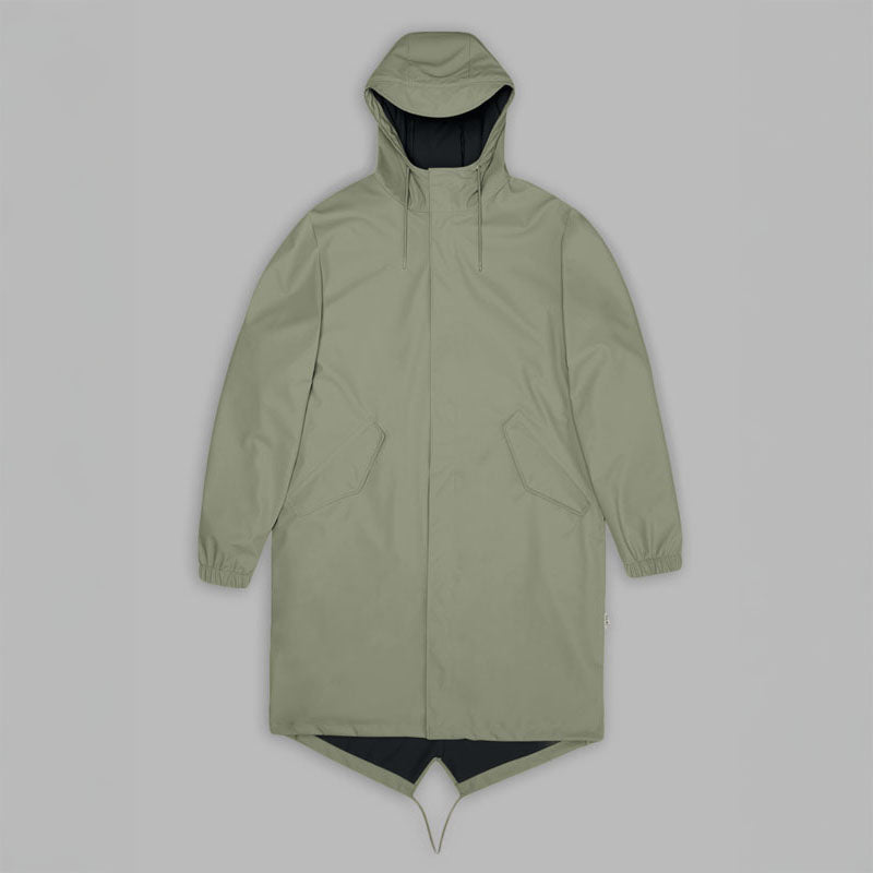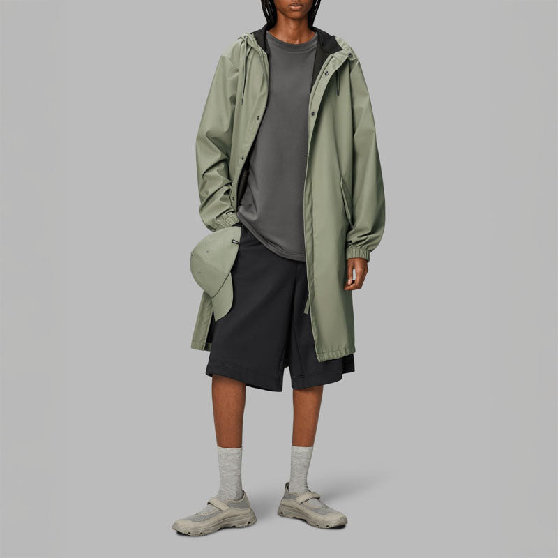 The super cool Fishtail Parka is a unisex raincoat that combines a minimalist design with practical functionality, featuring a drawstring fishtail hem in a parka-length cut.