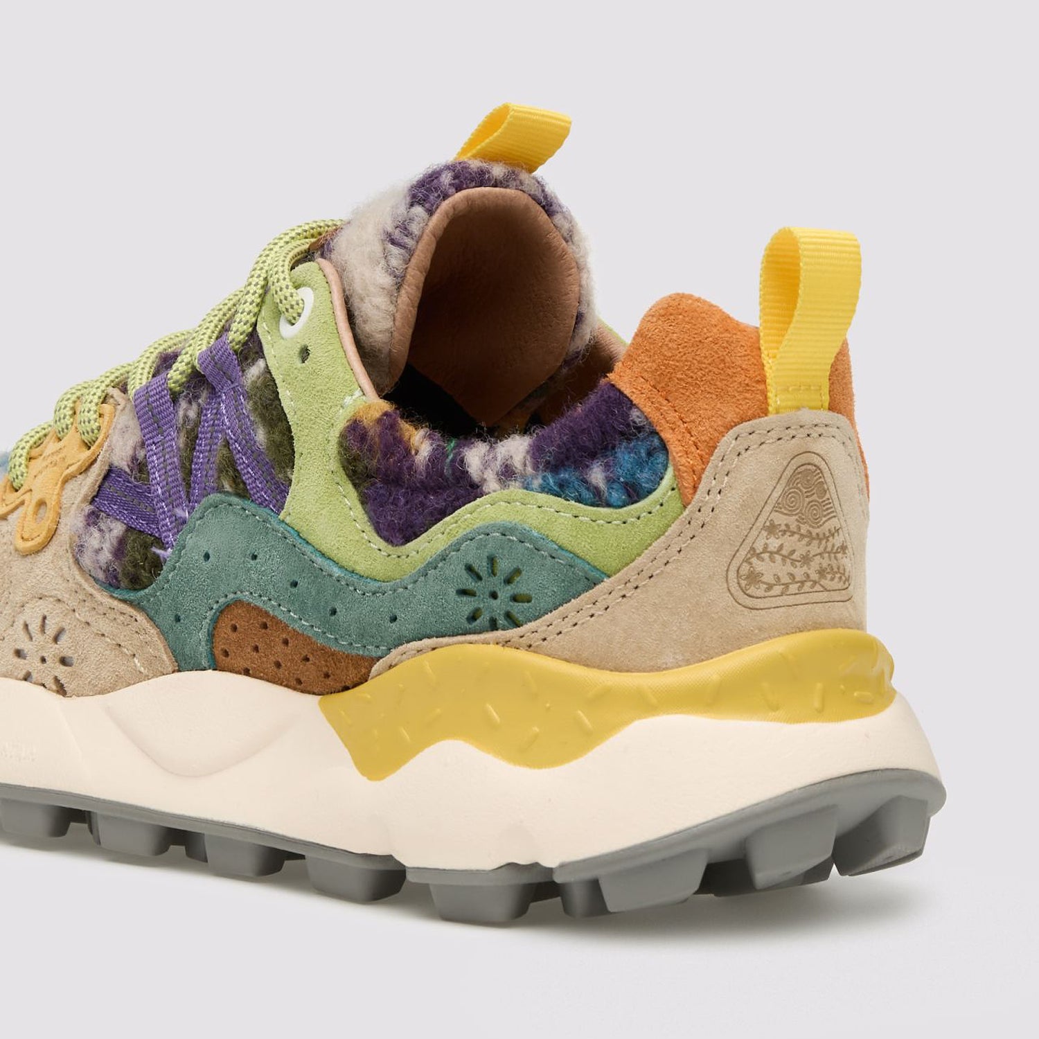Sneakers with serious outdoor influence and standout style. This design features a cosy teddy-effect fabric upper, paired with suede reinforcements for added durability and texture. Trekking-style laces in a contrasting hue thread through flower-shaped reinforced eyelets—blending function with playful detail.