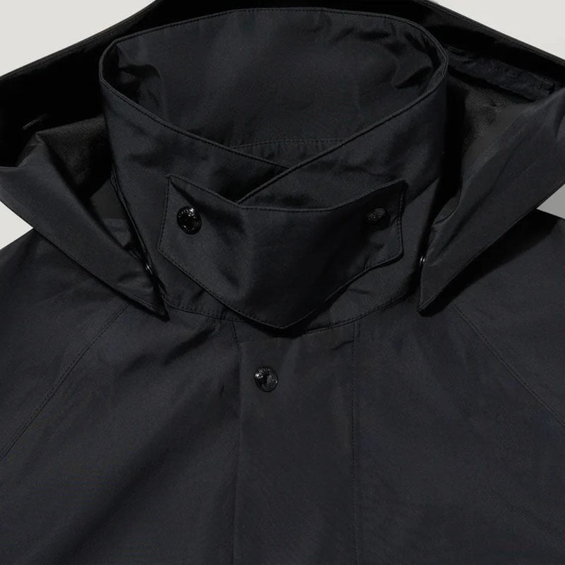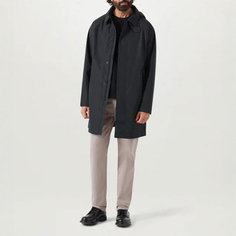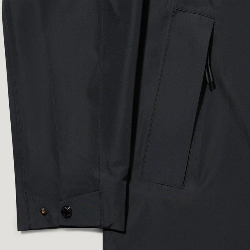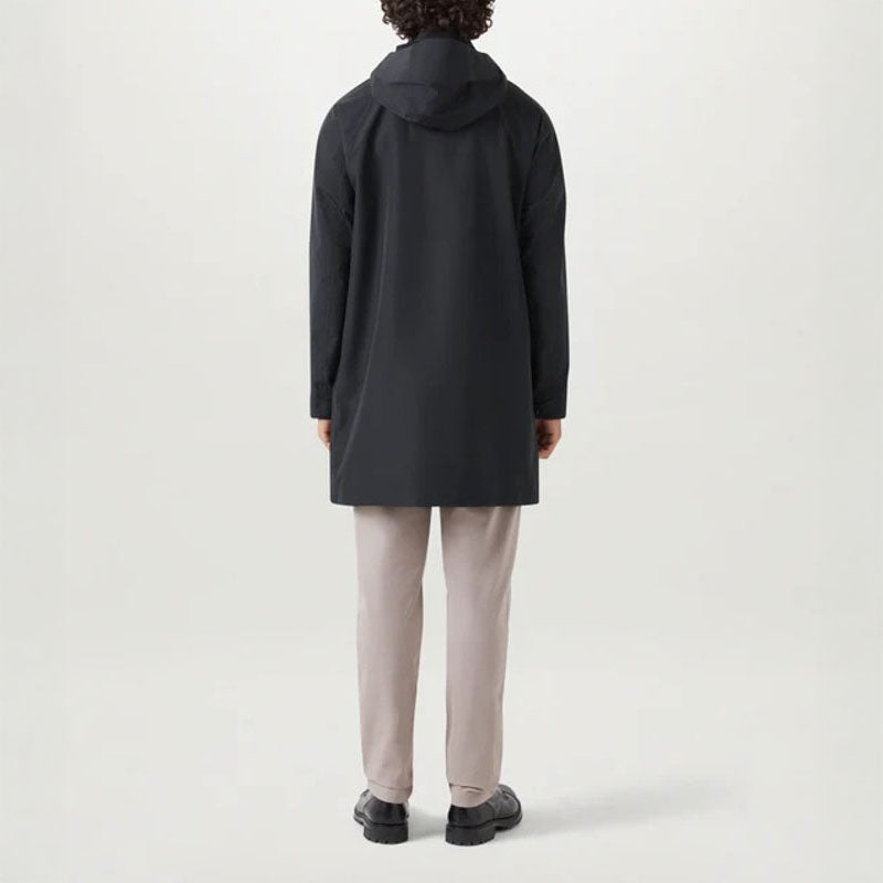 Meet the Force coat in black, your ultimate companion for spring-summer showers. It's crafted from our waterproof TriTech shell – a 3-layer bonded fabric with a smooth, polished surface and a crisp finish. It boasts a clean modern shape, relaxed fit for layering and point collar with detachable snapped throat latch.