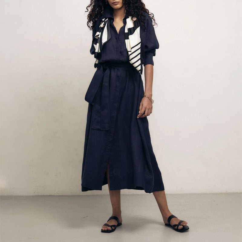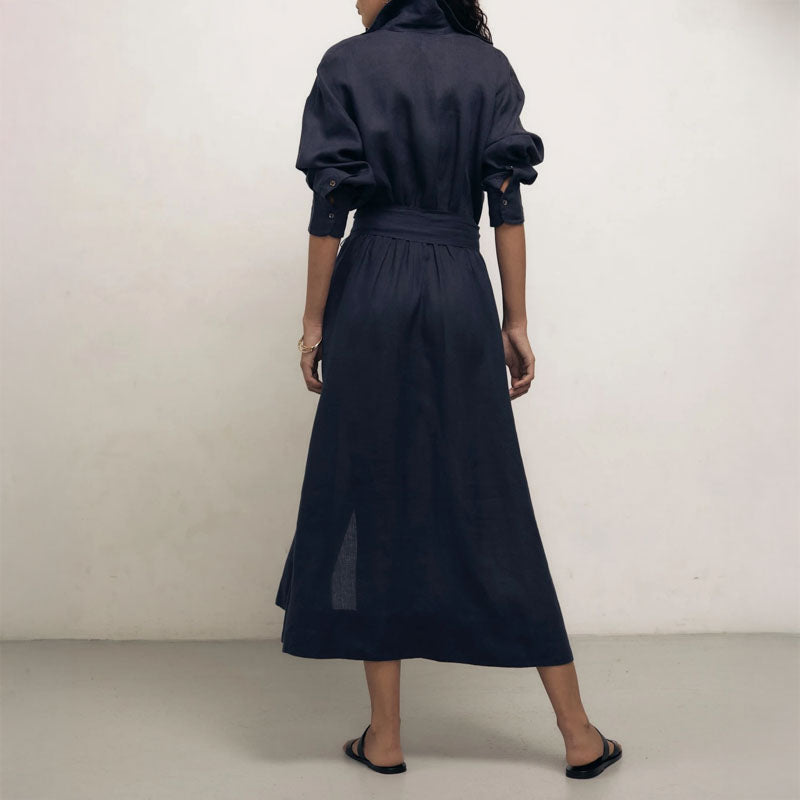 MONDO CORSINI Ira Linen Shirt Dress with Button Opening in Midnight