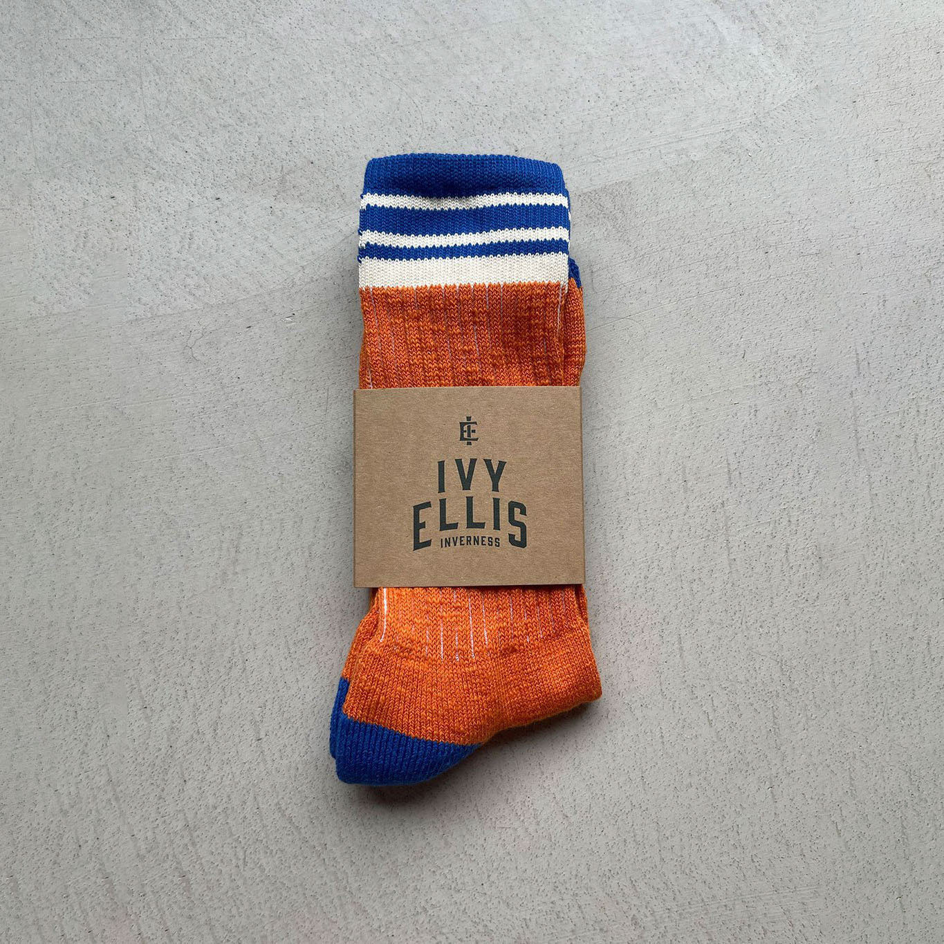 IVY ELLIS The Castlehill Men’s Slub Crew Length Socks in Orange & Cobalt Blue
