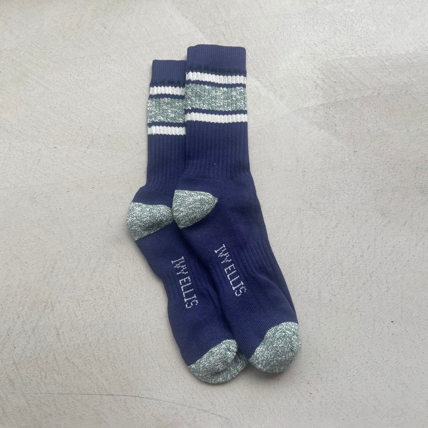 Bold, clean, and built to stand out, the Bjorn Crew Socks bring serious style from the ground up. With a deep navy base, cream and green slub stripes, and marl green heel and toe, they nail that vintage athletic vibe with a modern twist. The cool blue tones? Totally Collen & Clare. Effortless. Elevated. Everyday ready.