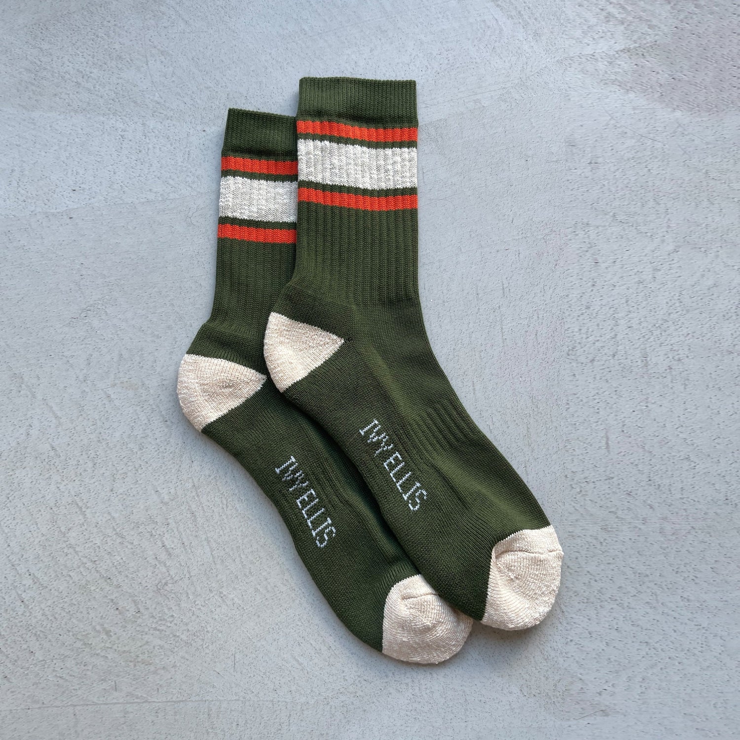 Part of the Pantheon Collection, the Sven Crew Socks blend bold design with classic comfort. Featuring a rich green base accented by vibrant orange and cream stripes, they nod to vintage athletic style while delivering a fresh, modern edge. A standout staple for everyday wear.
