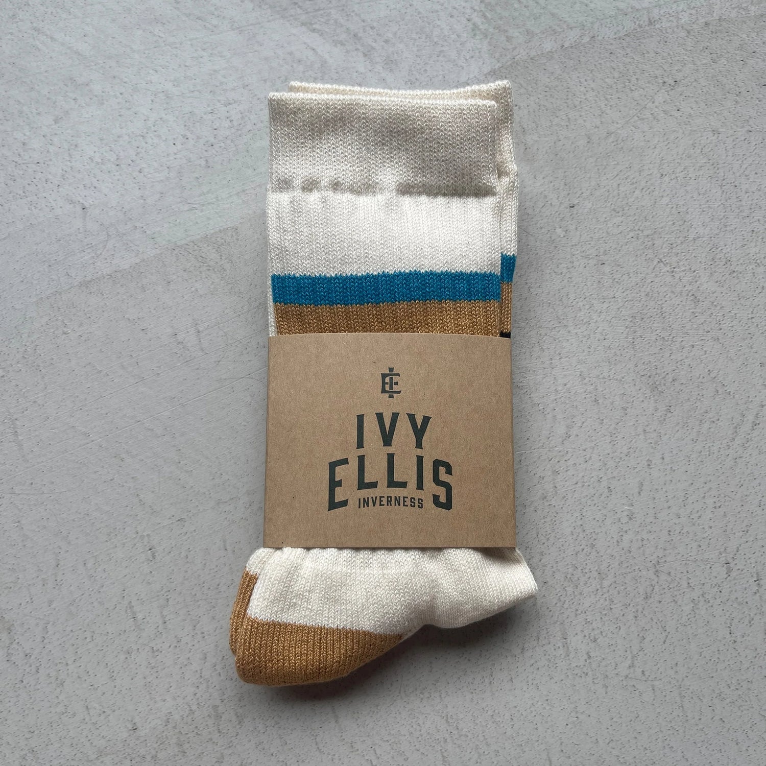 With a bold, earthy palette and a touch of understated elegance, The Dellucci Socks offer a refined interpretation of vintage sportswear. Featuring classic blue, brown, and black stripes set against a soft cream base, they’re finished with contrast brown heel and toe detailing for a subtle yet striking look.