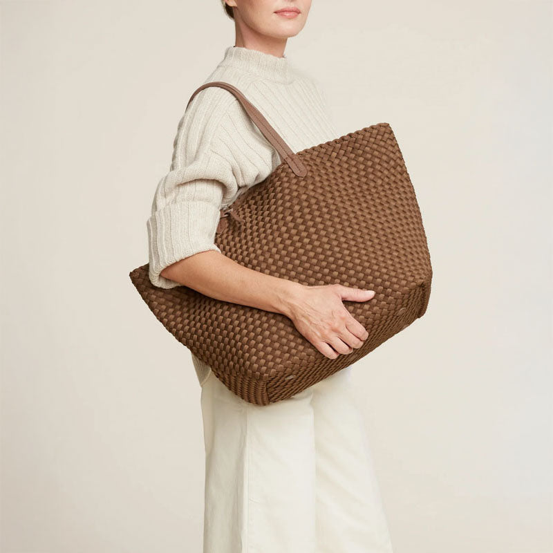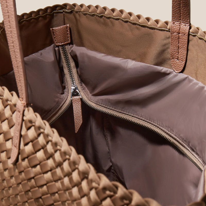 Handwoven neoprene with zipper closure and vegan leather handles in brown.