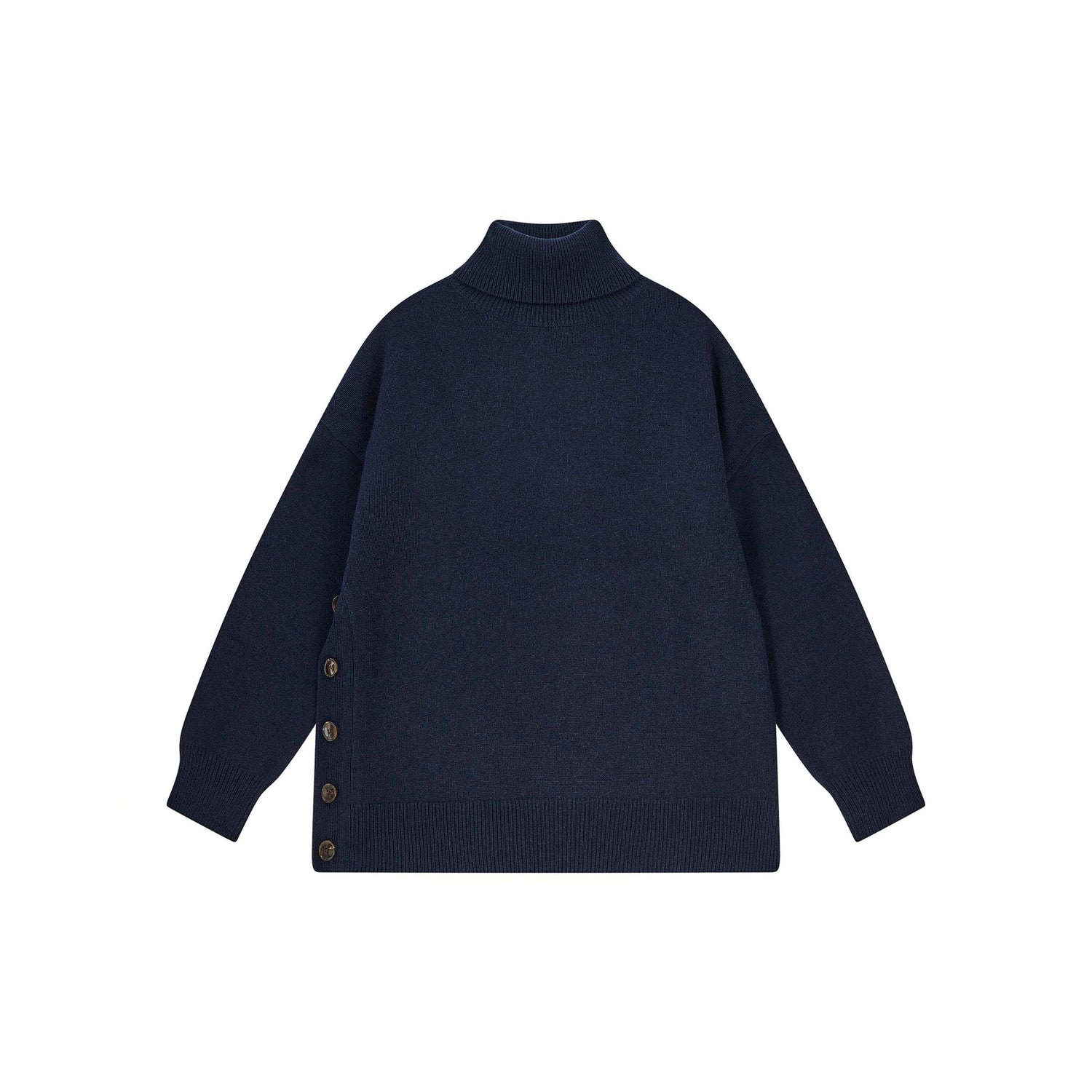 Jumper 1234 cashmere and wool jumper. Oversize navy roll neck in our cashmere and wool blend, heavier weight with a great button detail on one side.