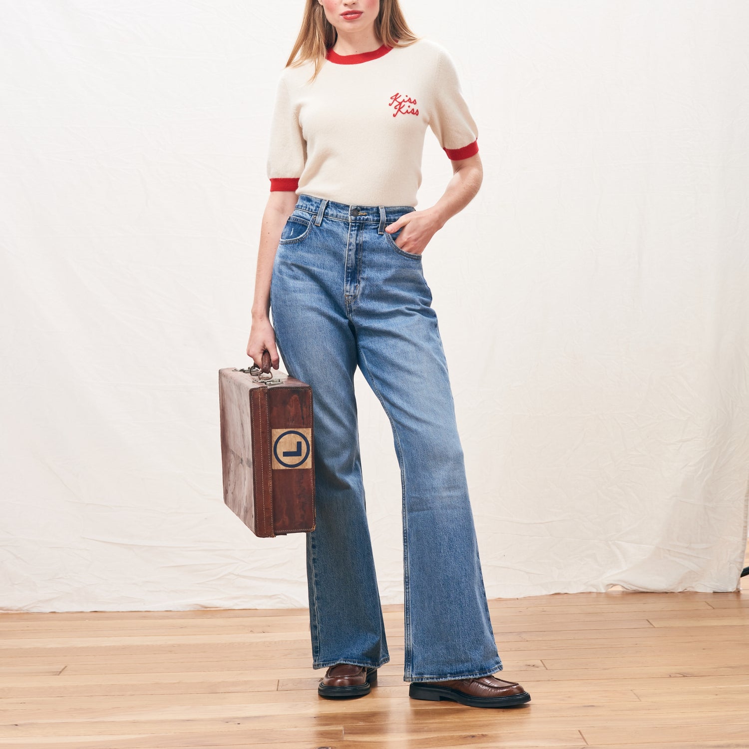 This Jumper 1234 cashmere crew neck jumper comes in a soft pink, finished with bold red “Kiss Kiss” intarsia... about as cute as it gets. Beautifully soft and easy to wear, it’s a playful statement knit that brings a pop of colour and charm to everyday outfits.