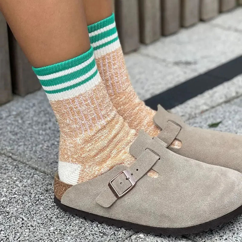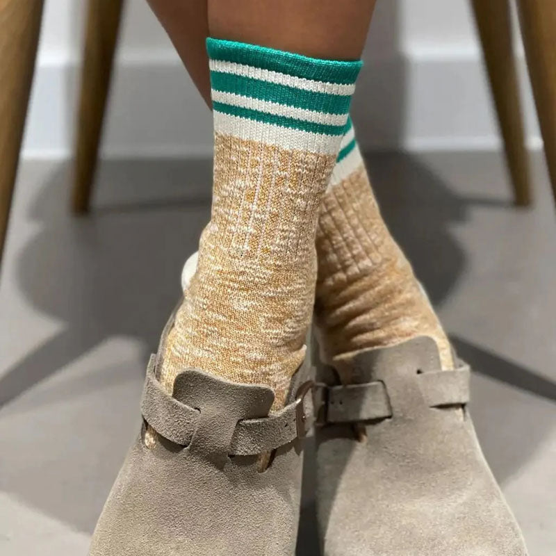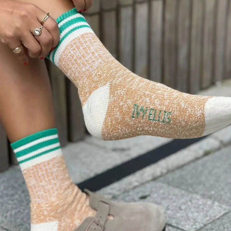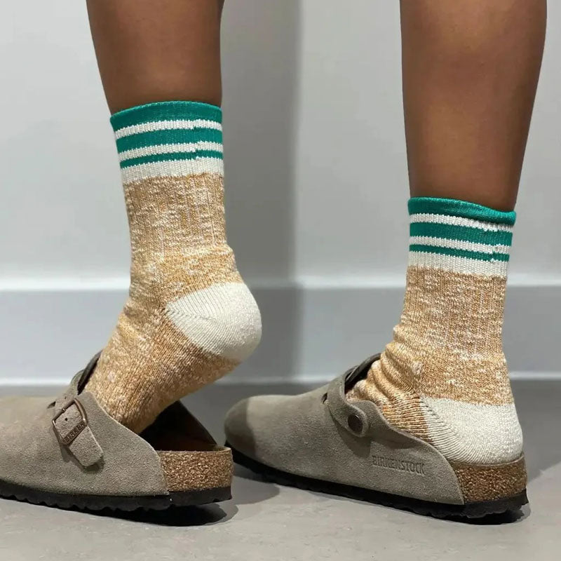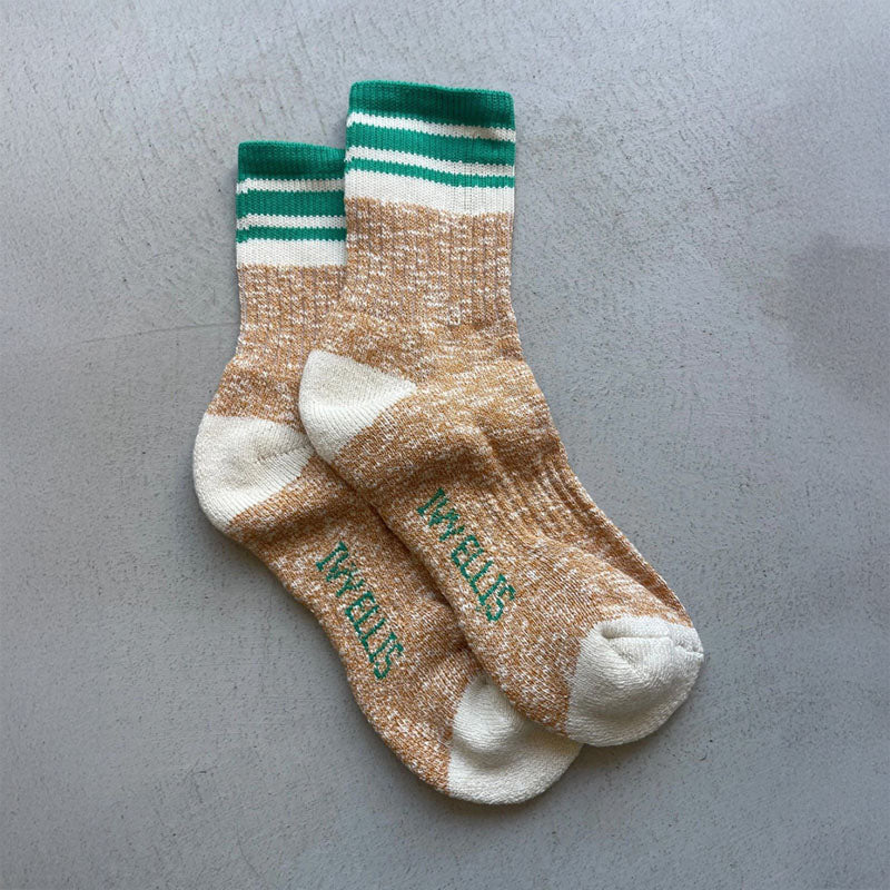 The Gairloch - named after one of the Scottish Highland coastlines. Made in a tan slub yarn with our signature vintage cream heel and toe. Contains 86% cotton, 13% polyamide and 1% elastane for extra comfort and durability. Finished with a soft elasticated top in forest green, for extra hold.