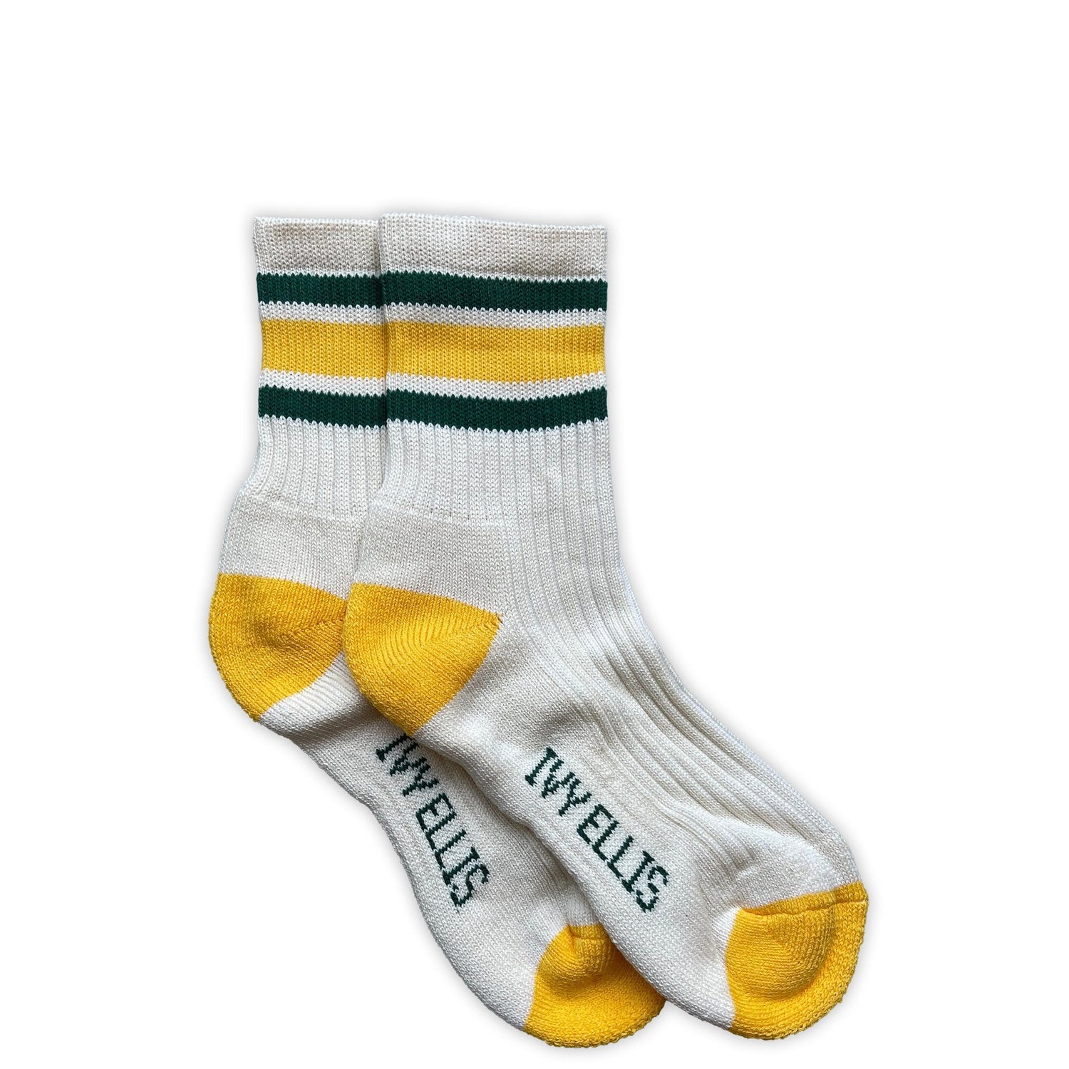 The Starr - named after Bart Starr, a Green Bay Packers legend. Made in a vintage cream yarn with a yellow heel and toe. Contains 86% cotton, 13% polyamide and 1% elastane for extra comfort and durability. Finished with a soft elasticated top in green, for extra hold.