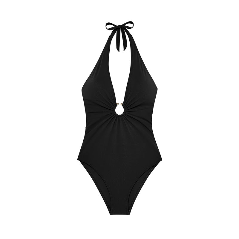 Elegant and eye-catching, the Leven One-Piece Swimsuit is designed to make a statement. In classic black, it features a deep neckline at the front and back, accented with softly gathered fabric and a striking gold-tone ring detail.