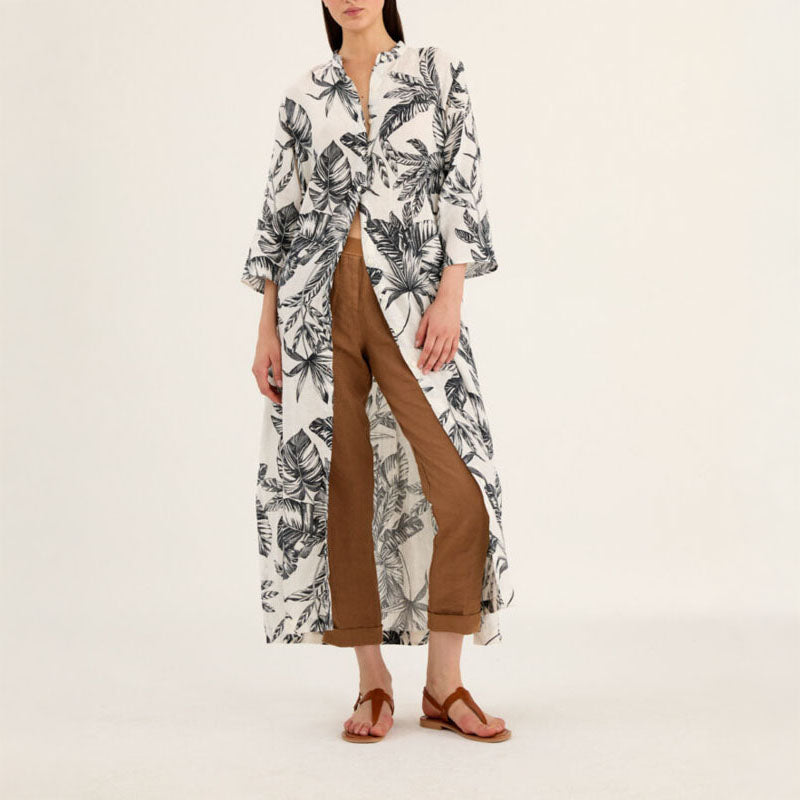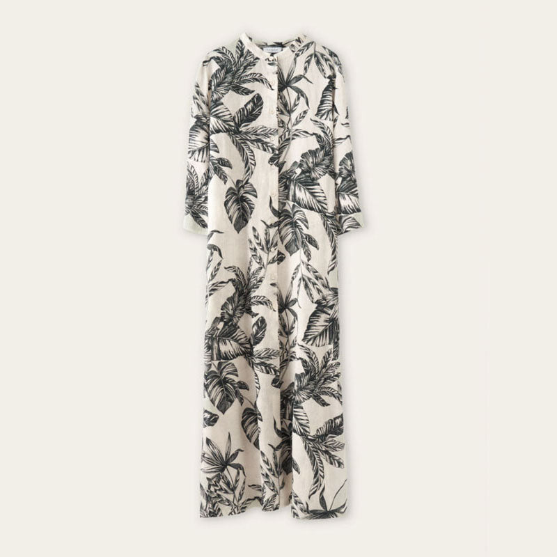 ROSSO35 Linen Maxi Dress in White/Black Palm Print