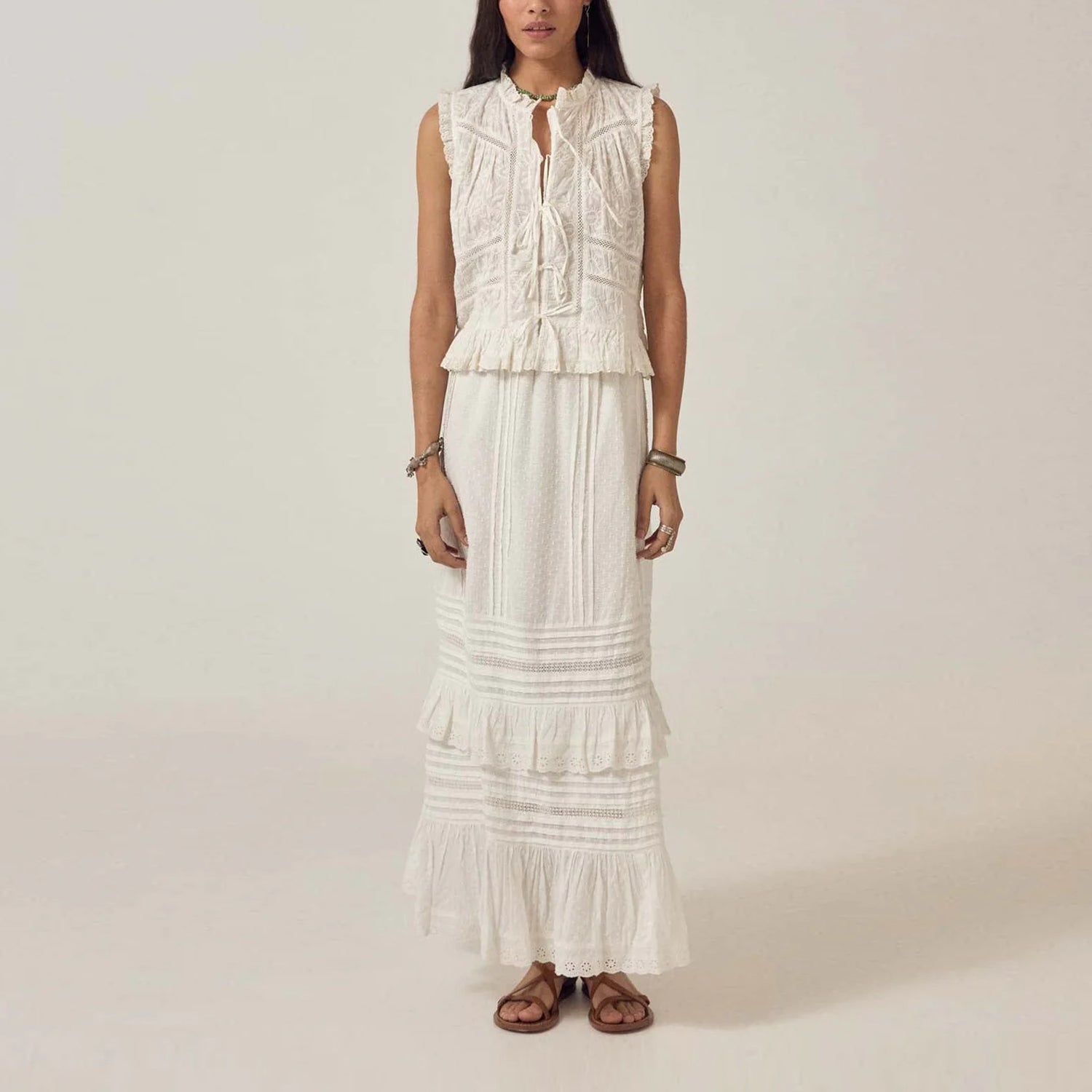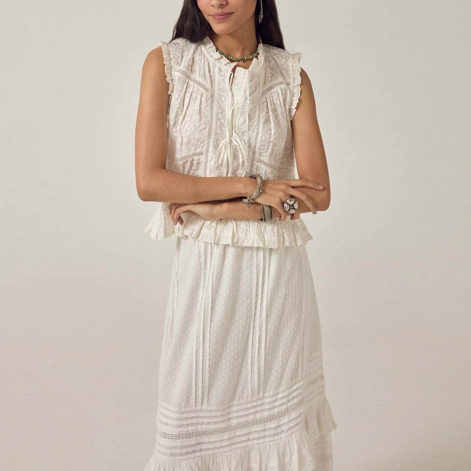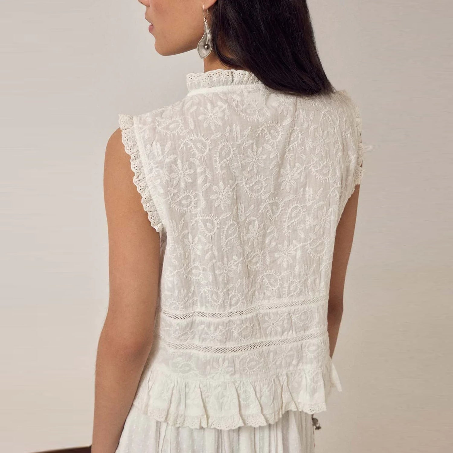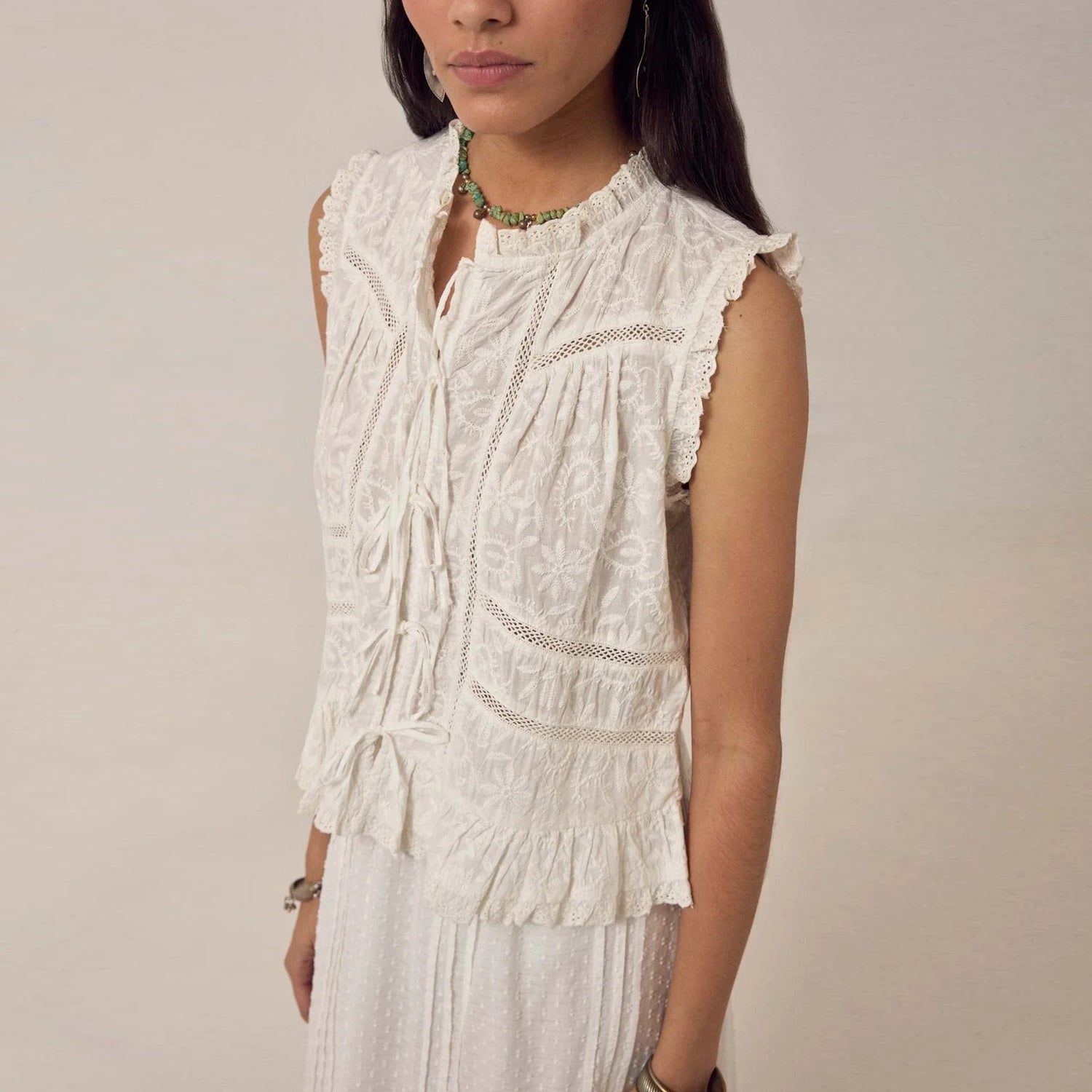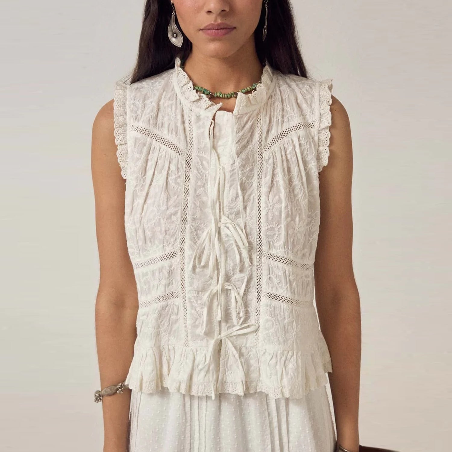 A beautiful addition to your wardrobe this cropped sleeveless top in warm ivory cotton schiffli with a lace up front. The round neckline is finished with a soft ruffle trim, leading into a lace up closure down the centre. A gentle ruffle peplum shapes the hem, while delicate lace trims frame the front panel and edges.