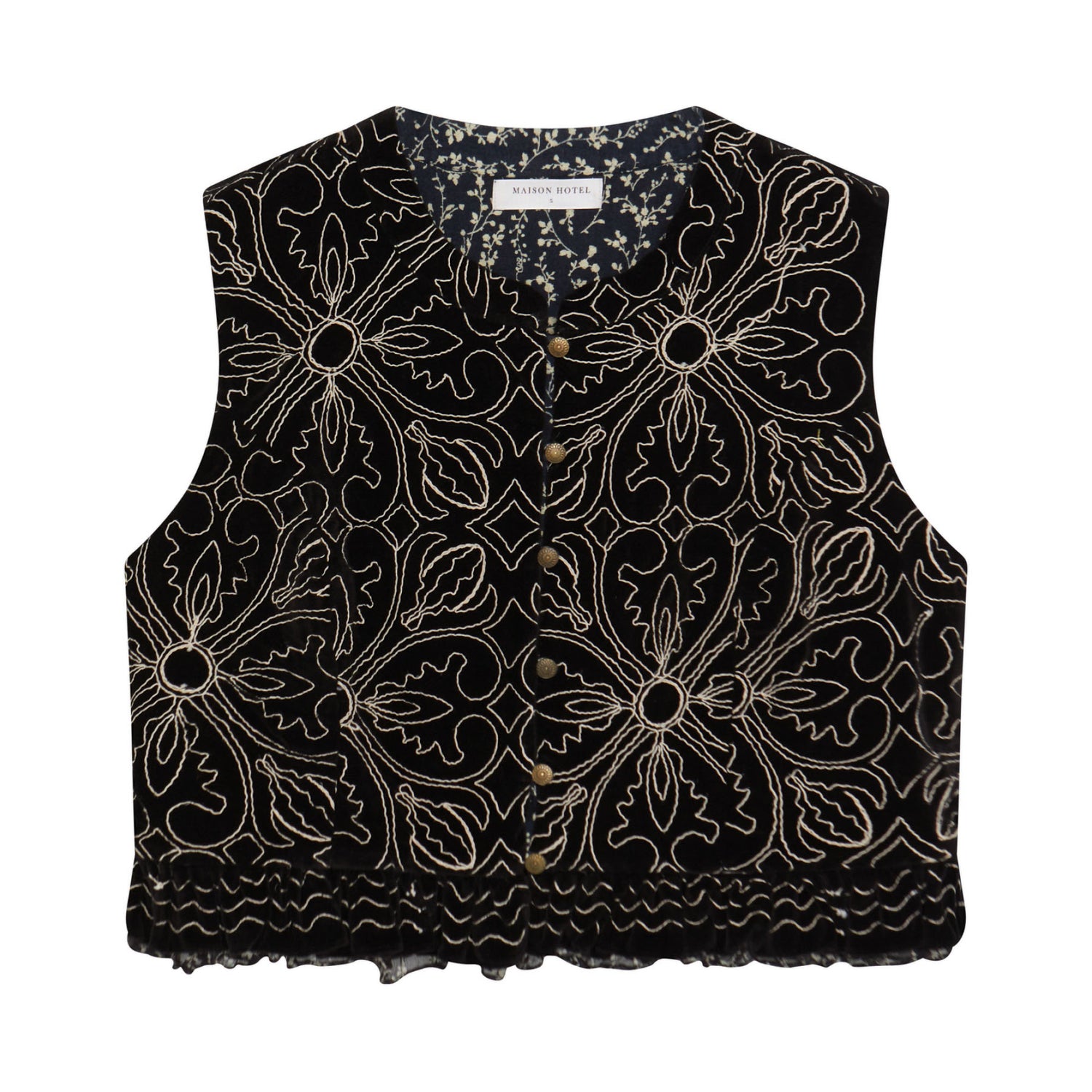 Crafted with a luxurious velvet-like finish, it’s adorned with intricate embroidery that adds a touch of charm.