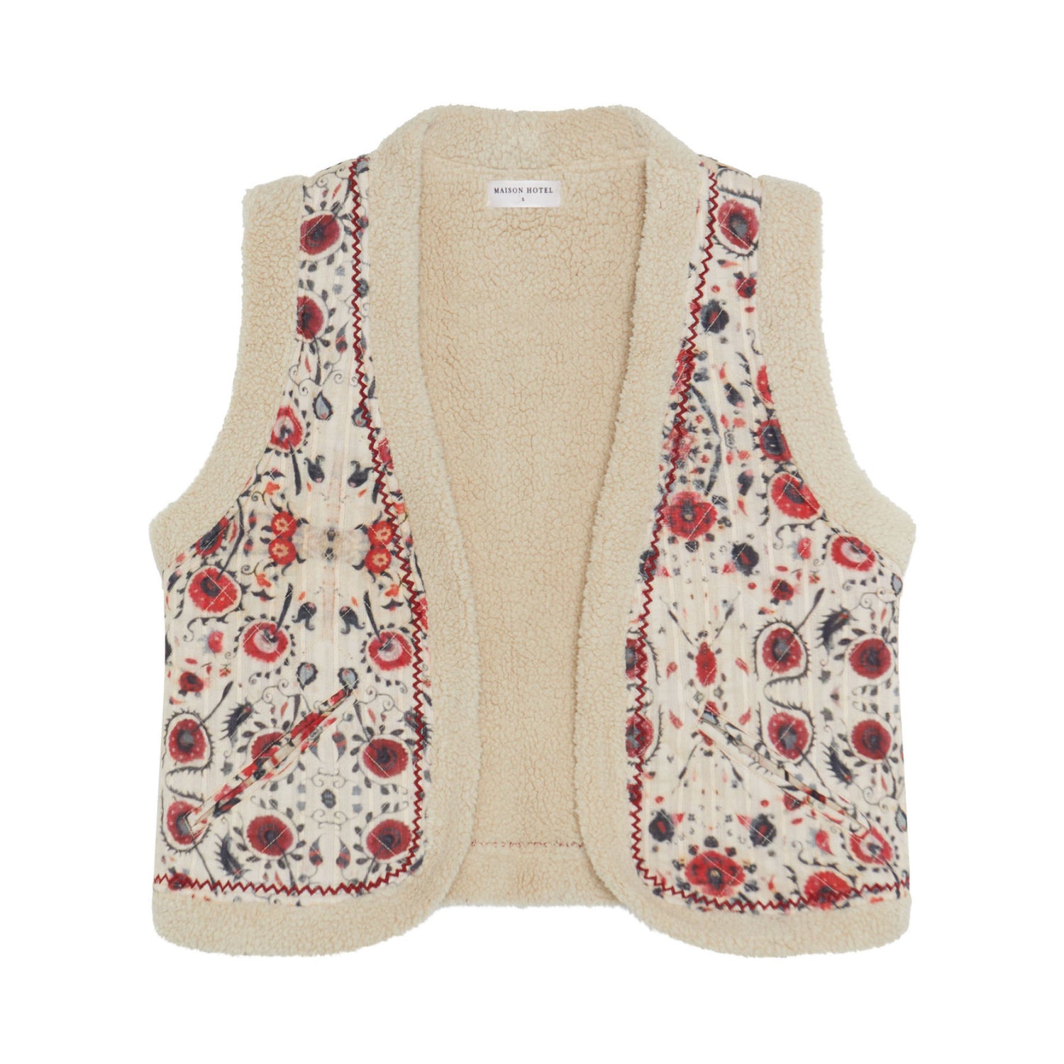 Crafted from quilted cotton dobby, this piece features a vintage-inspired print of blooming reds and earthy motifs set against a soft, pale background. Lined with cosy shearling, it offers warmth with a touch of nostalgic charm, like a timeless tapestry gently softened by years. Please note, this brand tends to run on the smaller side, so consider sizing up for the perfect fit.