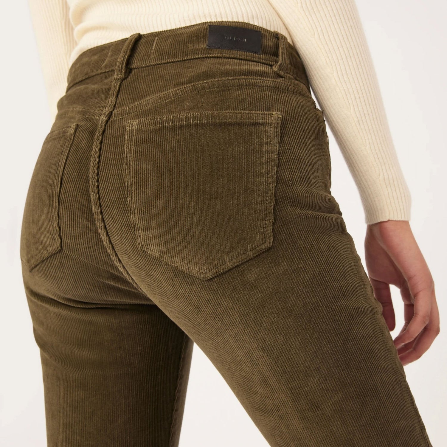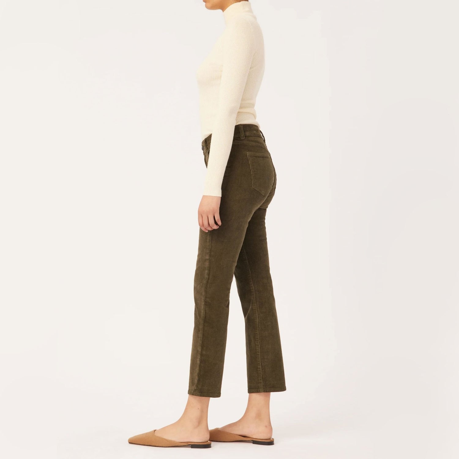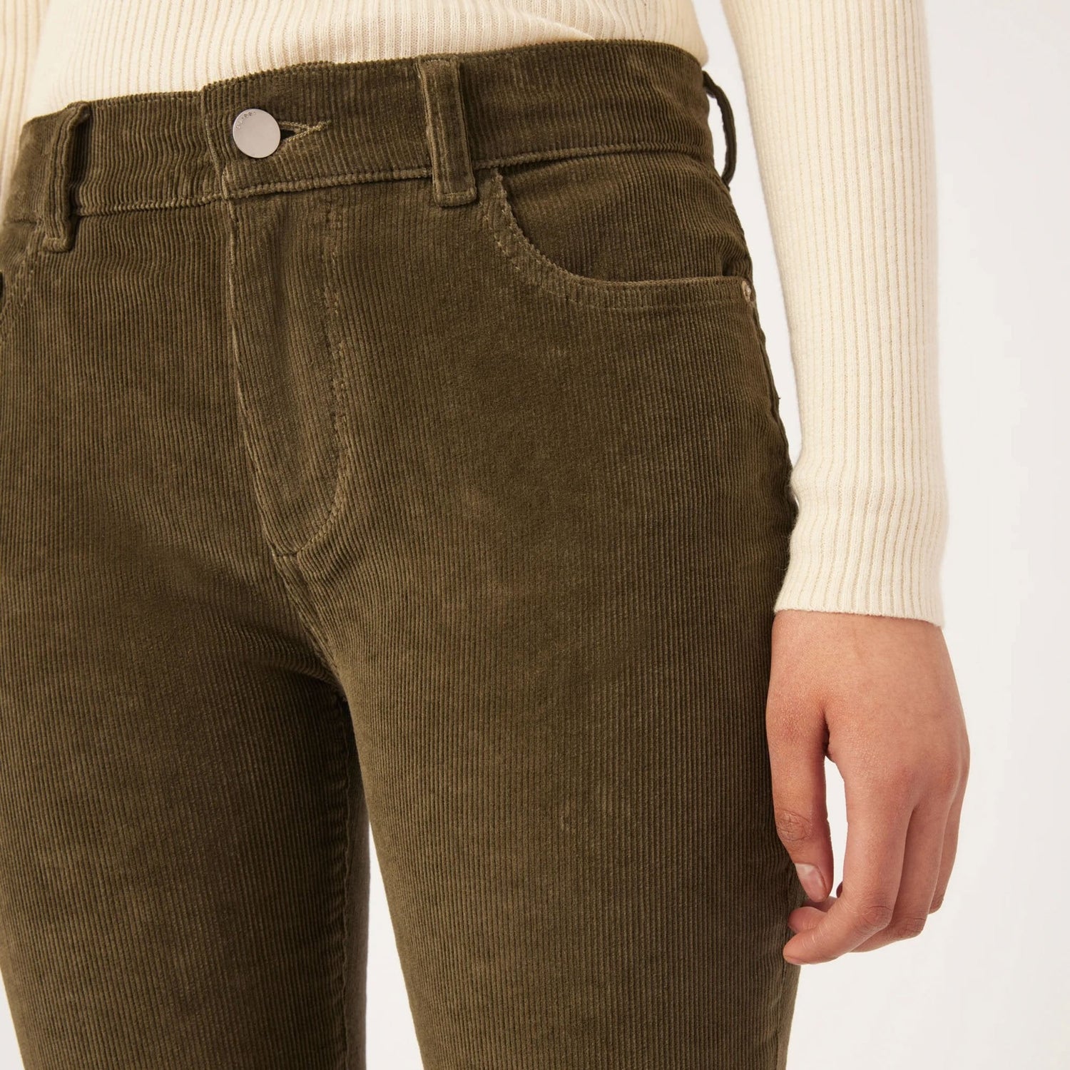 Dryad is a warm, dark green corduroy. It features brushed silver hardware, tonal stitching, clean hem and a black back patch.