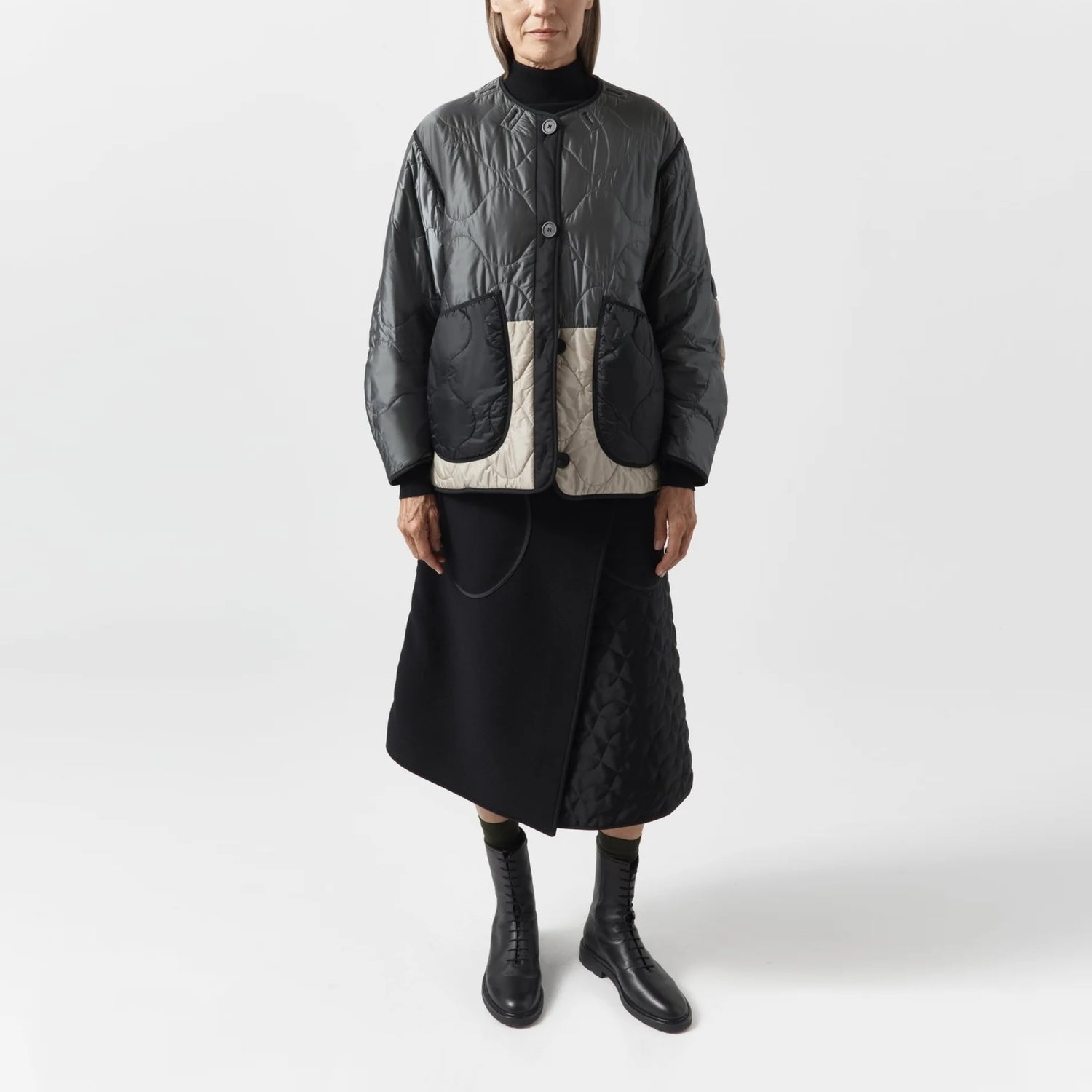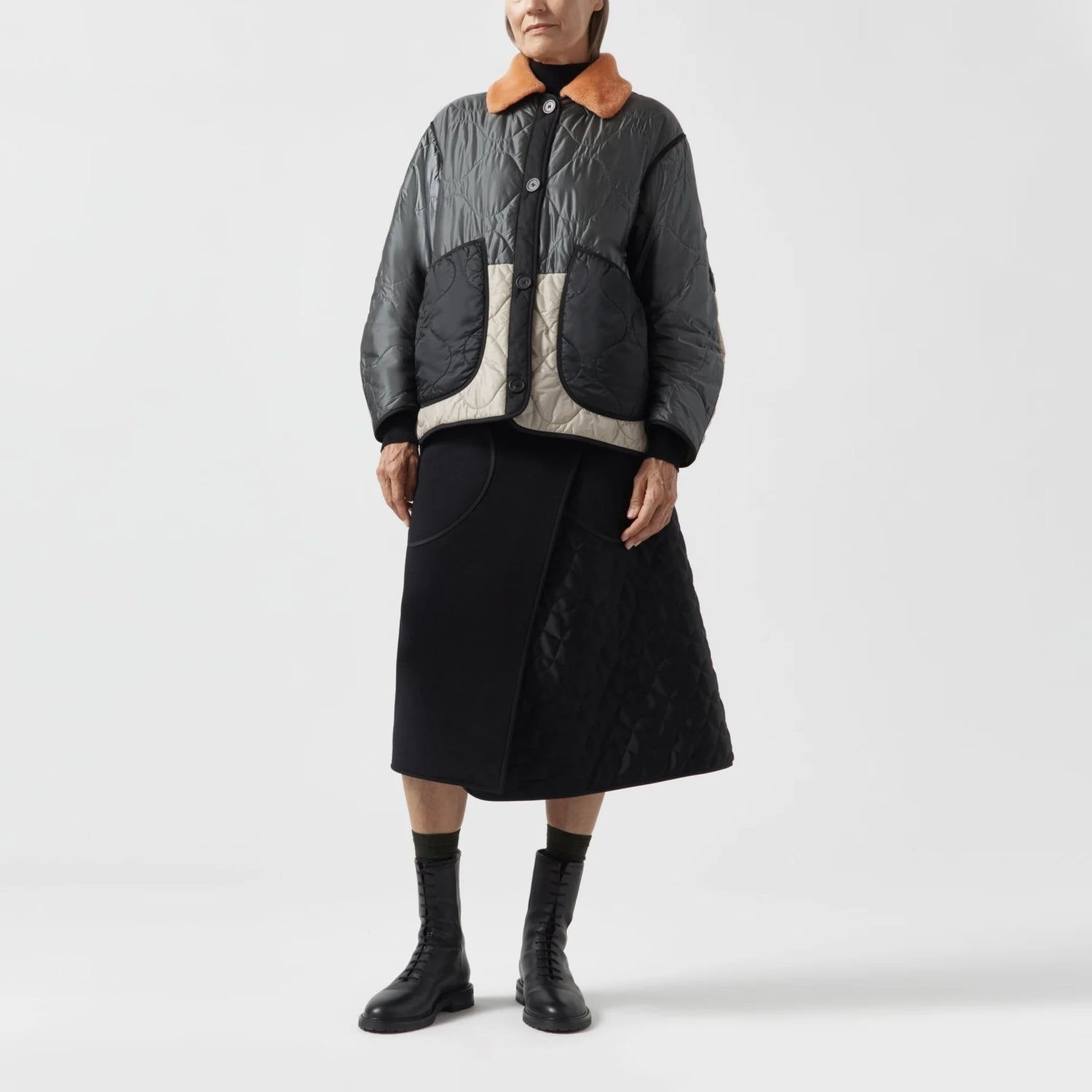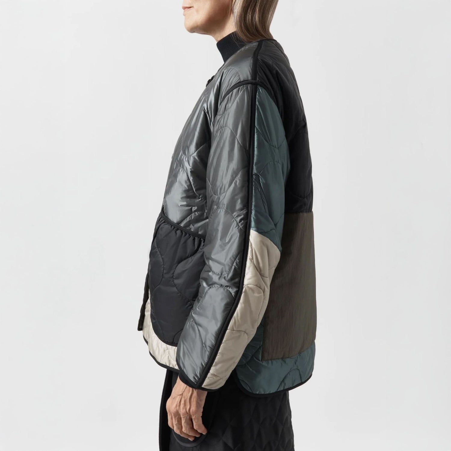 A stand-out piece with a geometric patchwork design, combining lightweight quilted and smooth panels, all crafted from surplus materials. It features dropped shoulders and a cocoon-shaped back for a relaxed, flattering fit. Fully reversible, offering versatile styling options