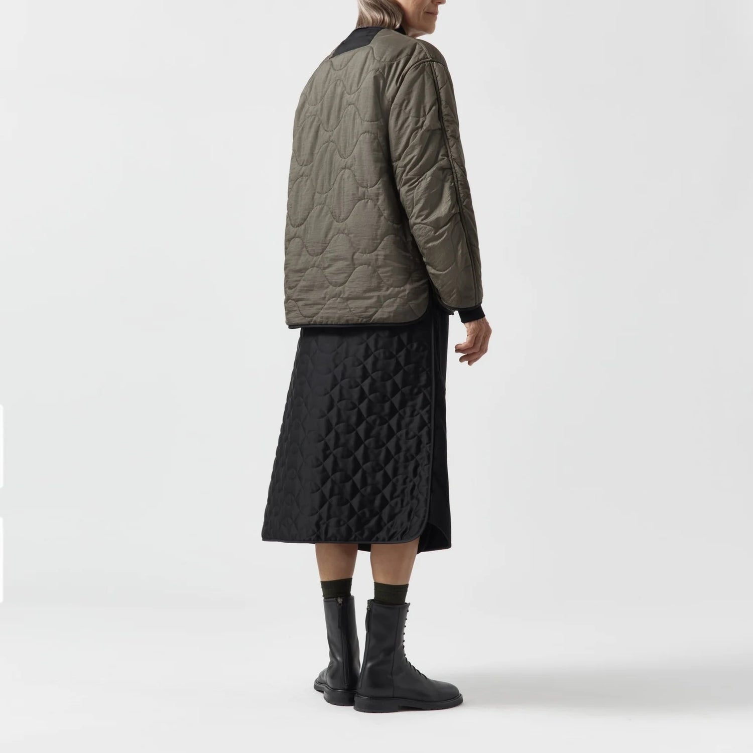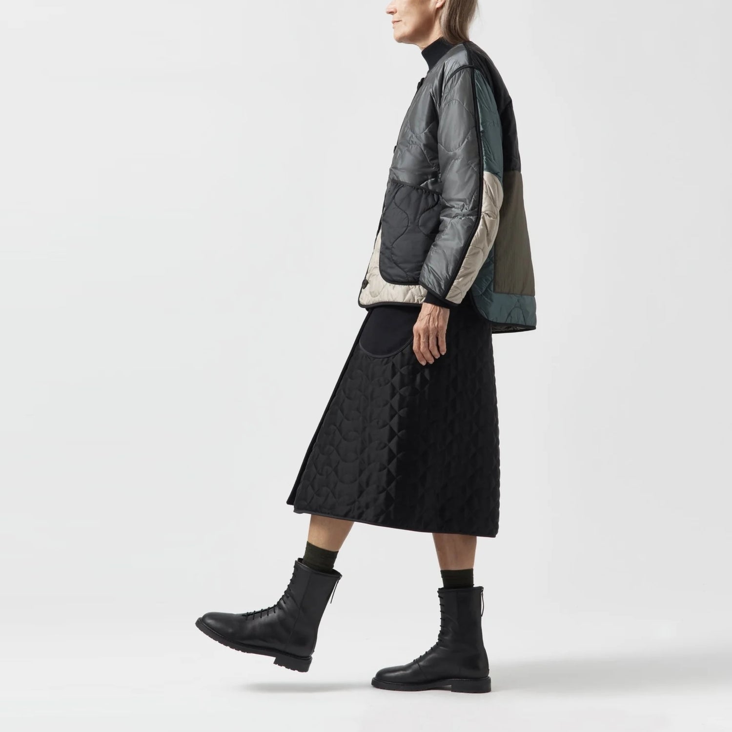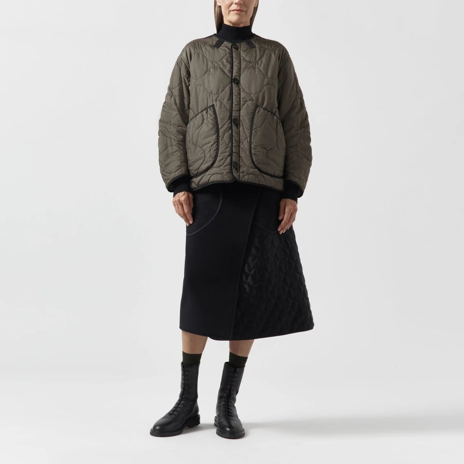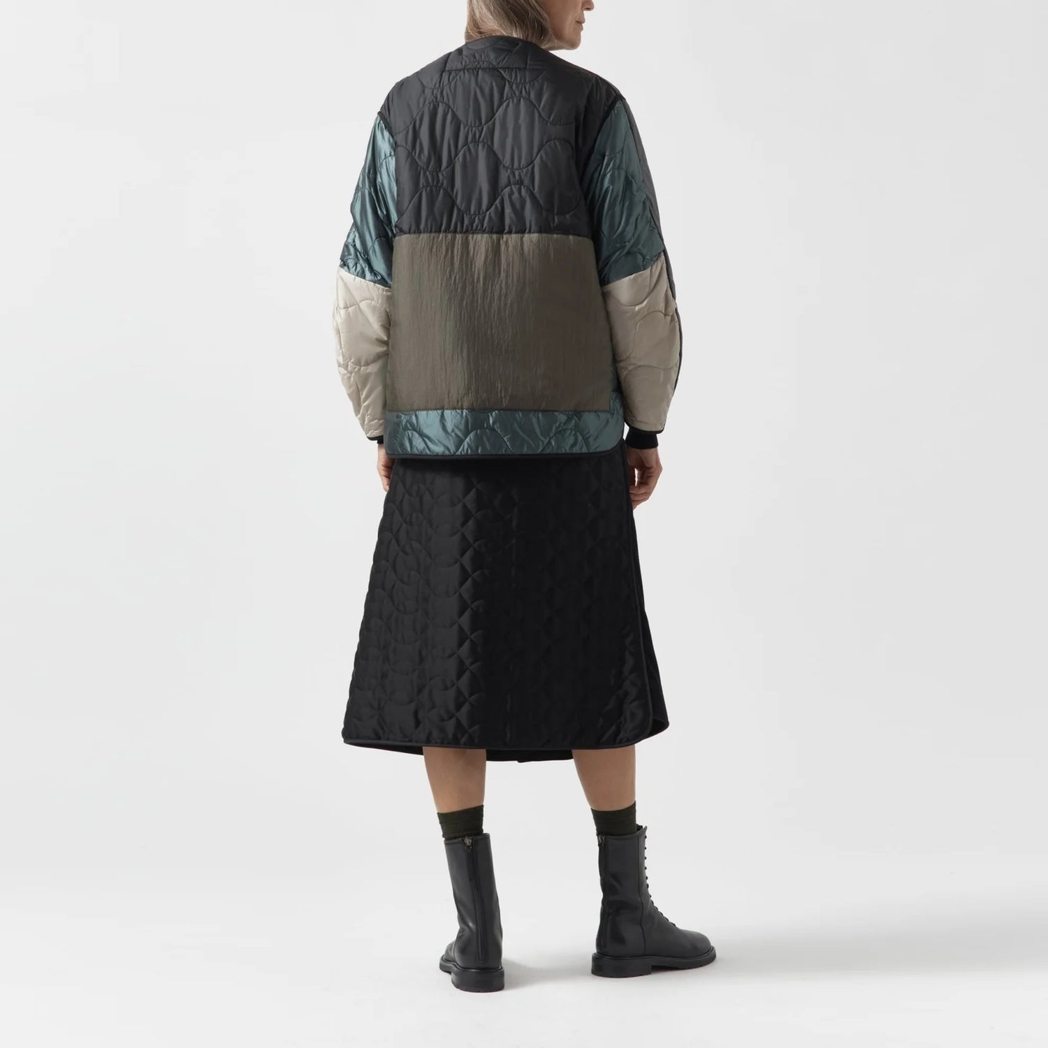A stand-out piece with a geometric patchwork design, combining lightweight quilted and smooth panels, all crafted from surplus materials. It features dropped shoulders and a cocoon-shaped back for a relaxed, flattering fit. Fully reversible, offering versatile styling options