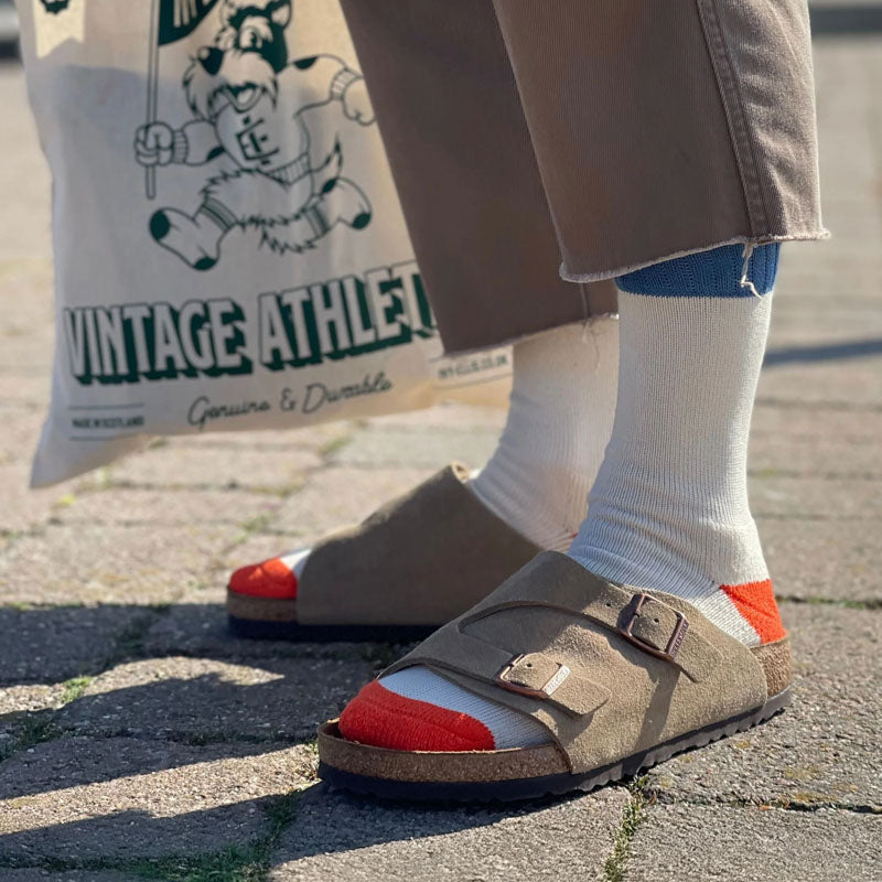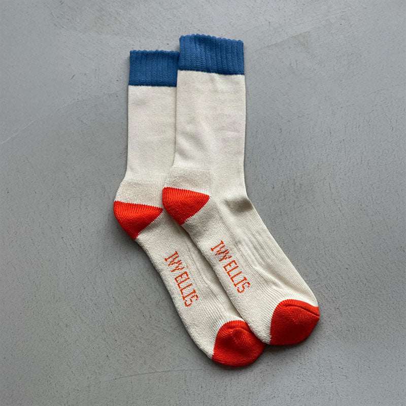 Crafted from lightweight yet durable ribbed cream yarn, The Campbell socks feature a red heel and toe, contrasted with a blue elasticated top for a distinguished look. The thinner shaft provides a breathable, lightweight feel while maintaining the premium quality expected from Ivy Ellis.