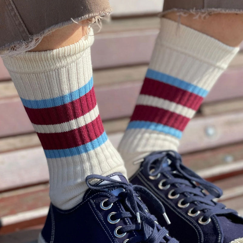 The Romeo Crew Socks by Ivy Ellis celebrate the golden age of athletic fashion with a modern twist. Featuring a ribbed cream base, claret heel and toe, and light blue and claret cuff stripes, they strike the perfect balance between bold retro energy and everyday elegance. With breathable comfort, a snug fit, and reinforced durability, The Romeo is made to stand out—season after season.