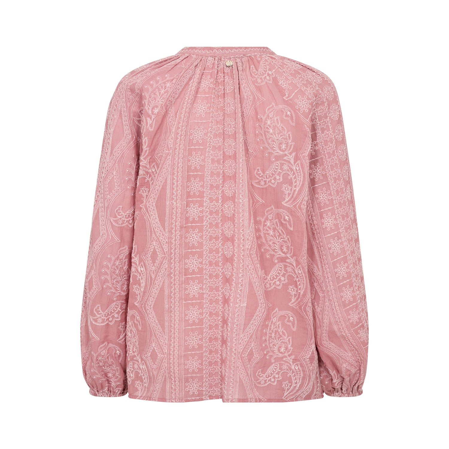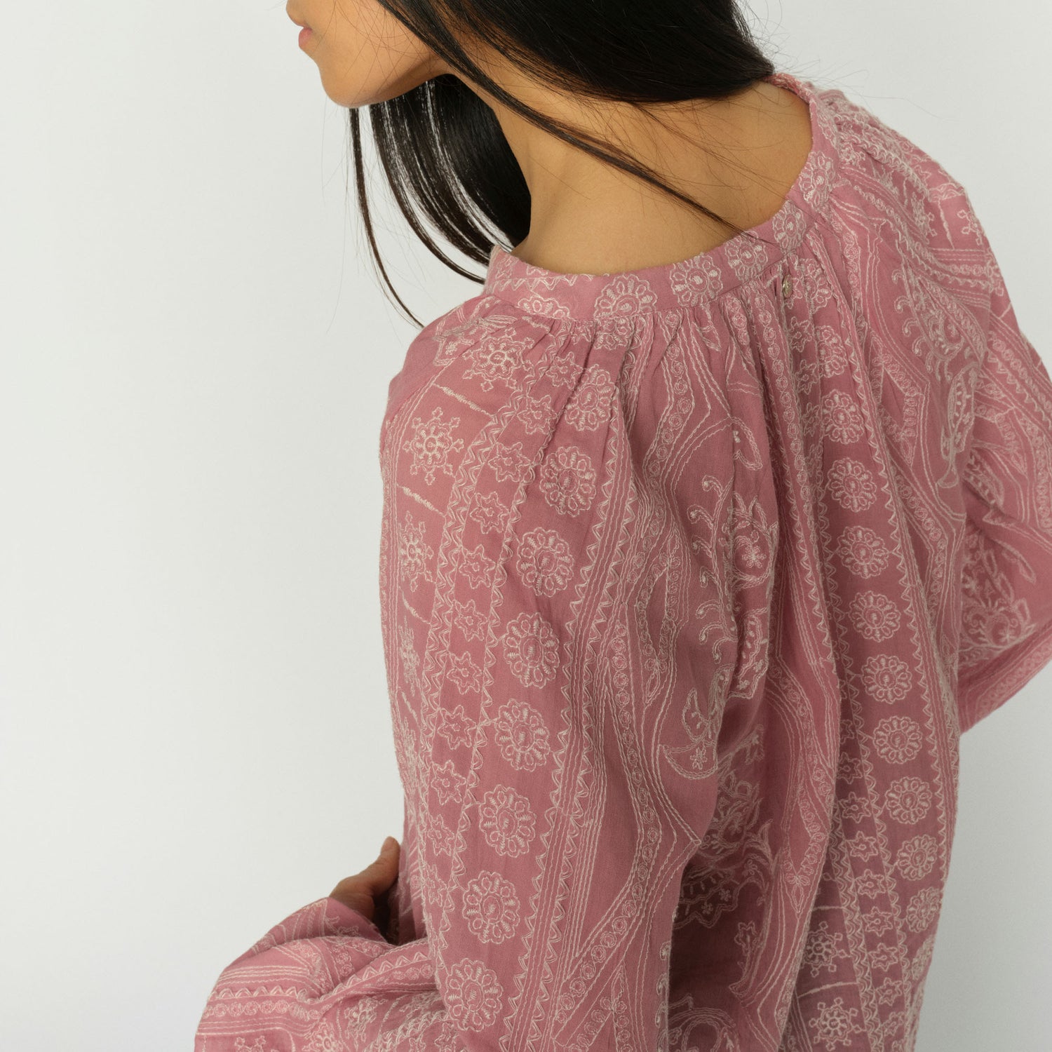 A statement blouse crafted from soft cotton and detailed with intricate tonal embroidery for added depth and texture. Designed with a flattering V-neckline and a relaxed silhouette, it’s finished with elasticated cuffs for gentle volume. Style it with denim or tailoring for an effortlessly bohemian feel.
