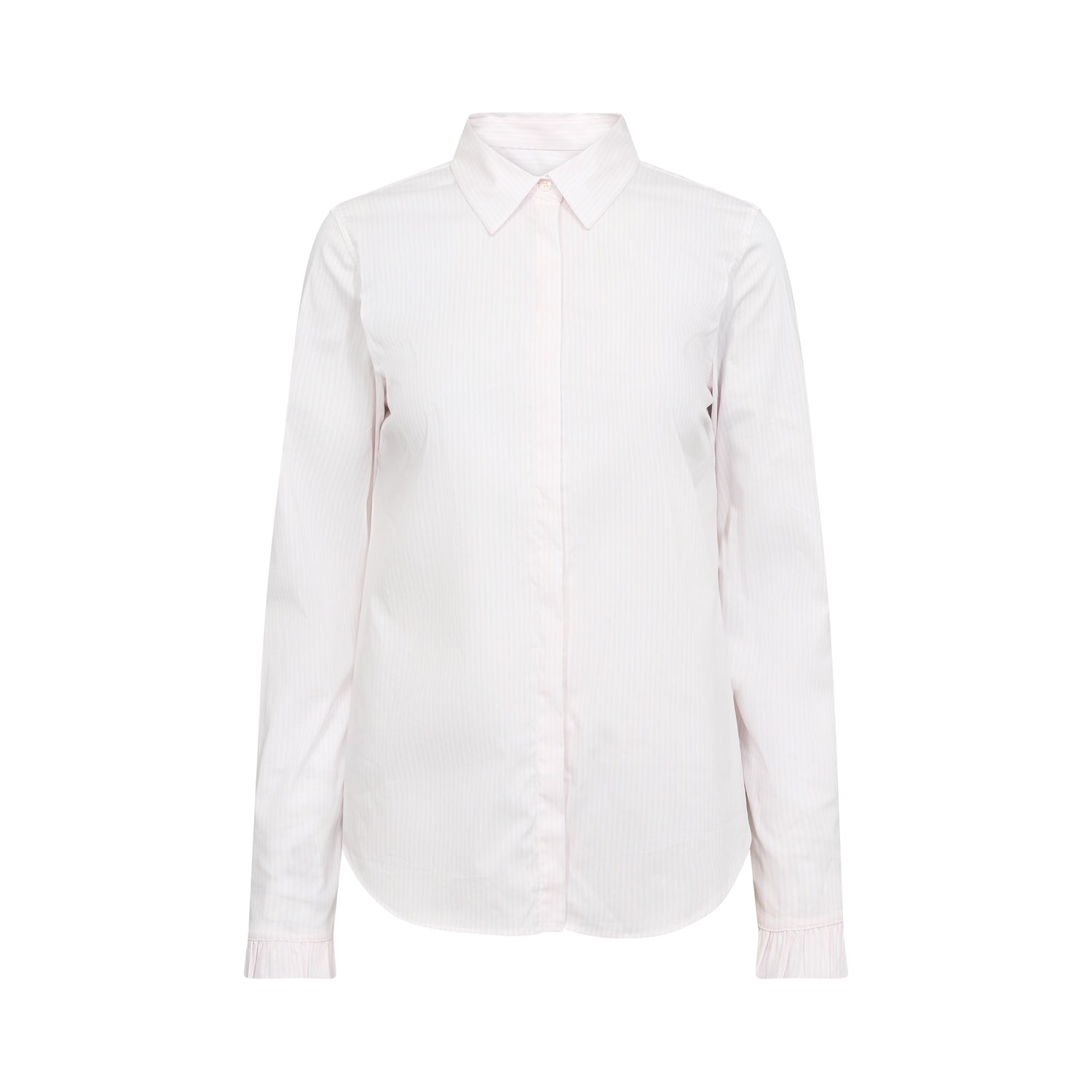 A refined shirt with a classic touch. Designed in a regular fit with a button closure, long sleeves, and a sharp collar. The subtle stripe pattern adds a timeless feel, while the small frill details at the cuffs bring a feminine twist. Perfect for styling with tailored pants or jeans for an effortlessly chic look.