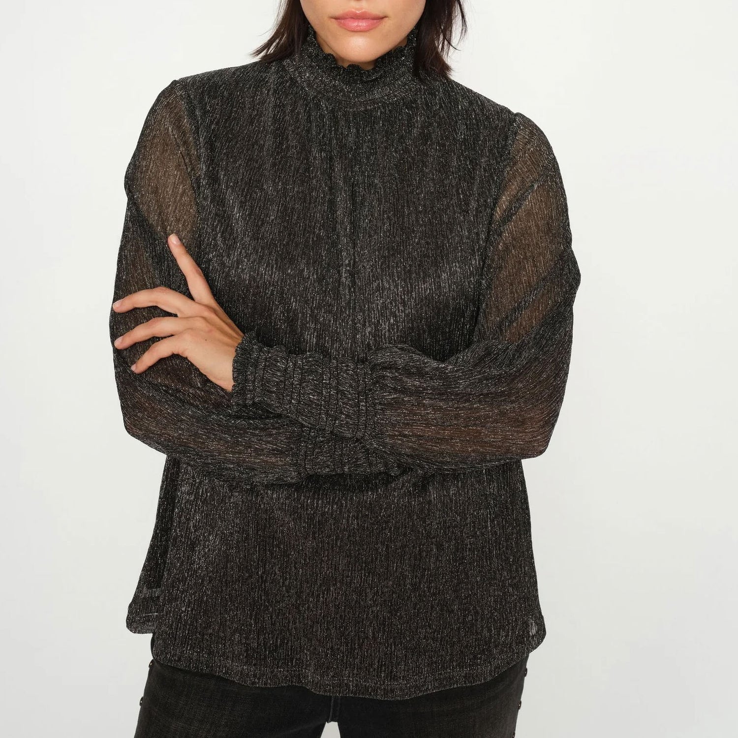 This elegant blouse captures effortless glamour. Crafted from a lightweight, semi-sheer fabric woven with delicate metallic threads, it shimmers softly while feeling smooth against the skin. The voluminous sleeves are gathered at the cuffs for a graceful shape, and the high ruffled neckline lends a refined, romantic finish.