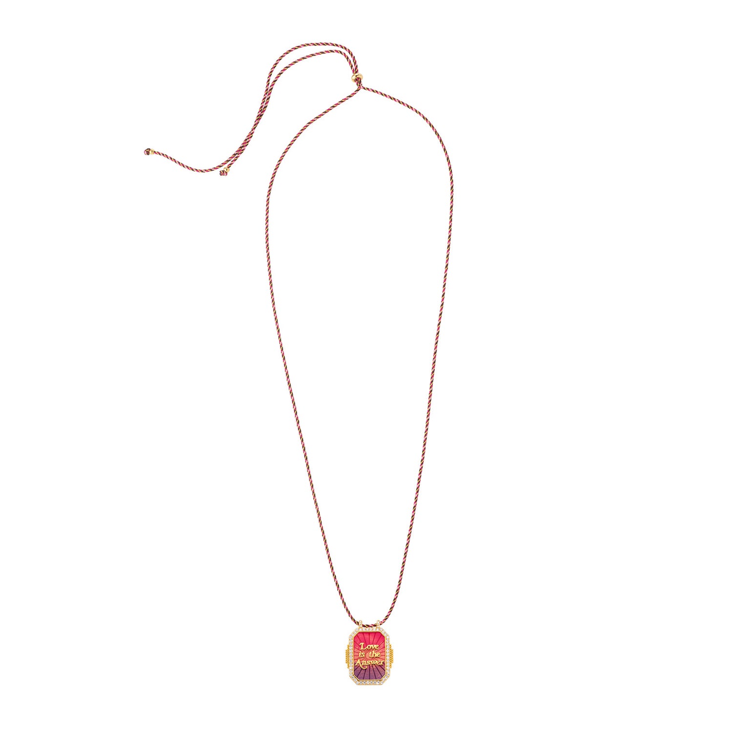 Its fuchsia and violet enamel plate is engraved with the words "Love is the answer", radiating positive energy with every wear. Finished with a braided cord in matching hues, it brings a carefree touch to any look and the perfect gift!