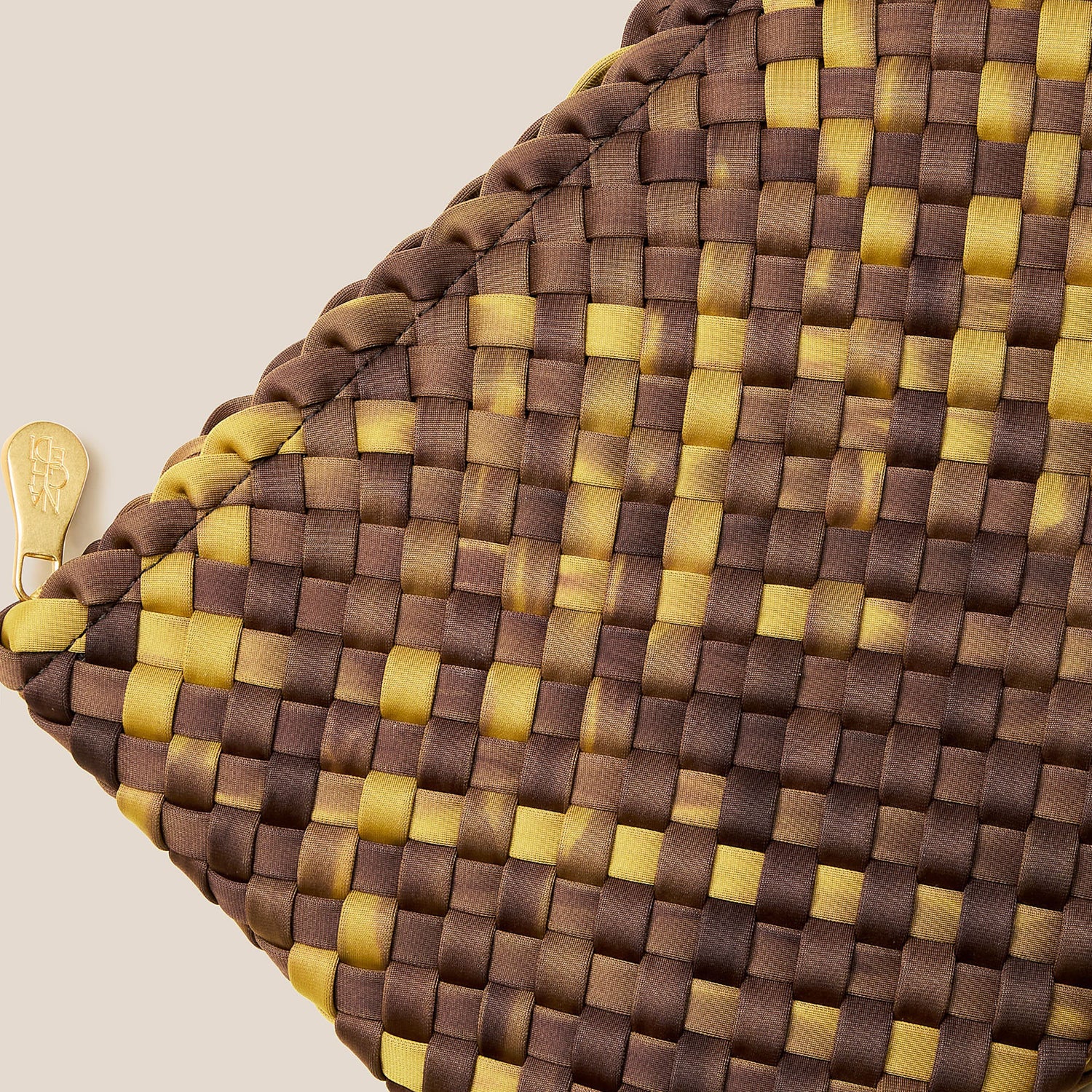 Handwoven neoprene in a rich Citrine and Chocolate watercolour, a warm, tortoiseshell-inspired blend that adds depth and character to any look.
