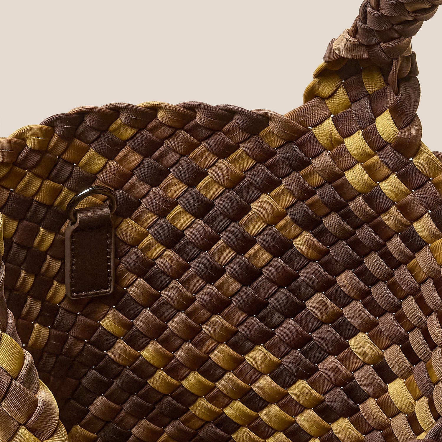 Handwoven neoprene in a striking mix of Citrine and Chocolate, creating a beautiful, tortoiseshell-inspired effect that’s both unique and wearable.
