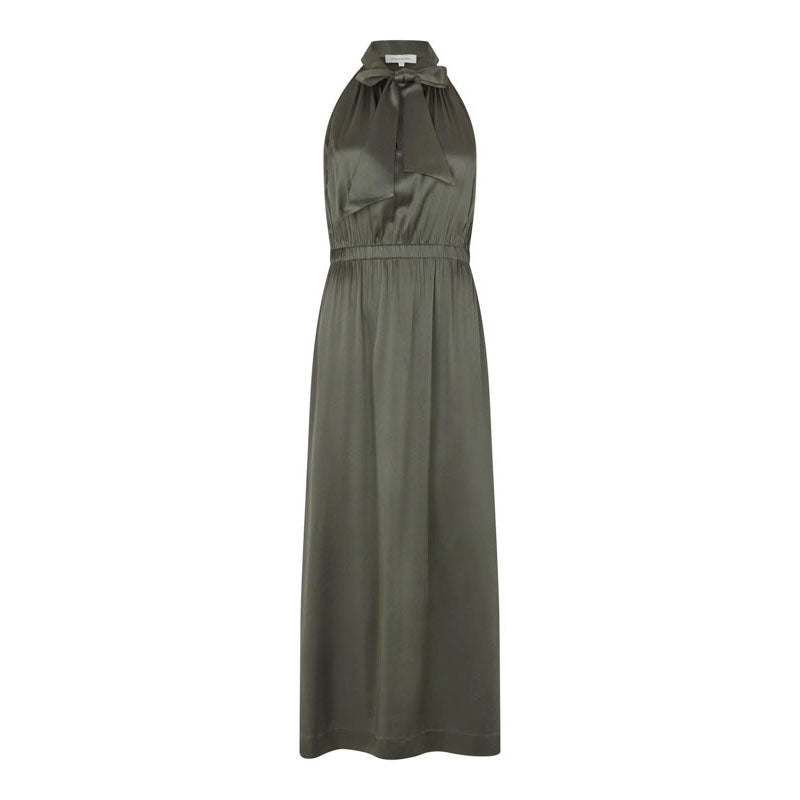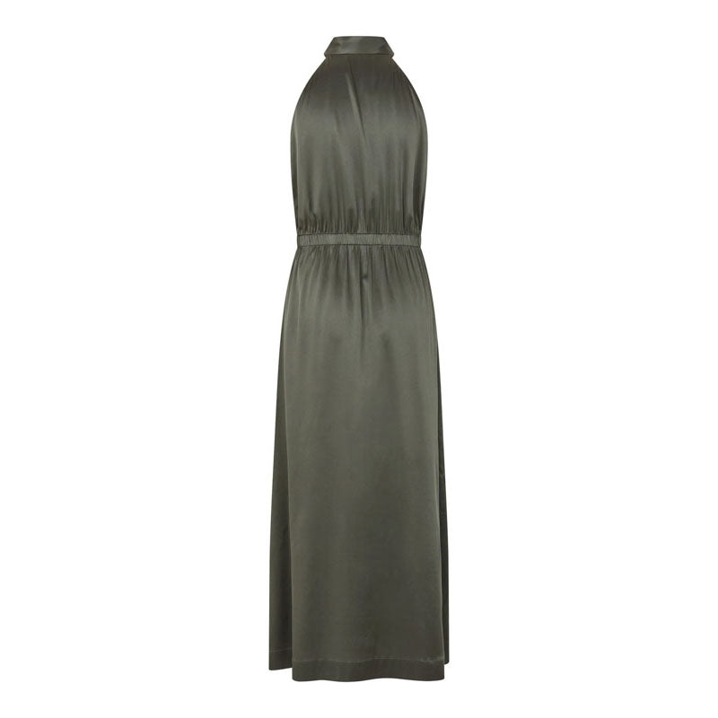Sophisticated and feminine, halterneck dresses always add a dose of real glamour to evening events. This full length version has a scarf neck that can be tied in many different ways and deep slits at the side. The silk satin fabric is in a deep shade of khaki.