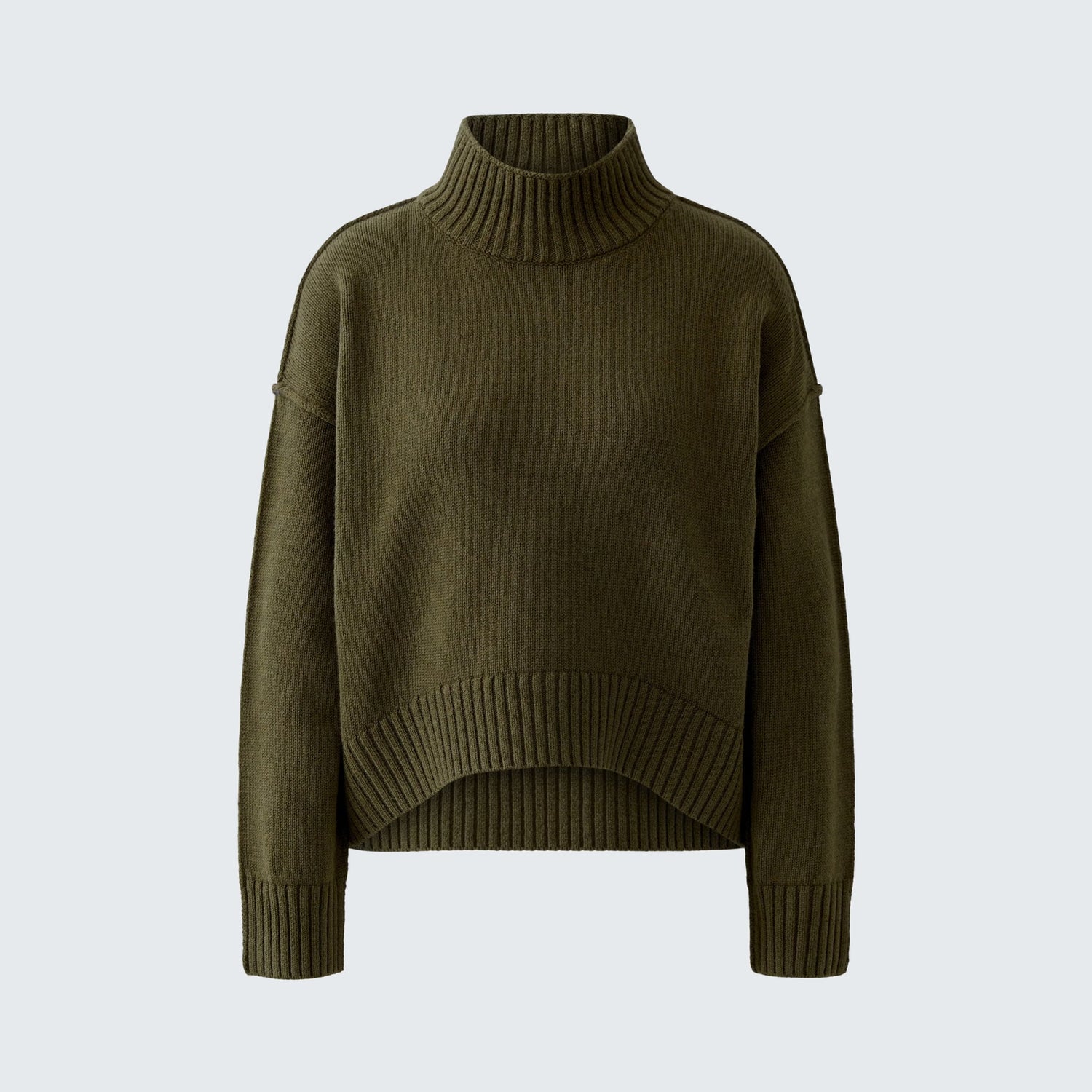 The oversized silhouette features dropped shoulders, wide ribbed cuffs and a ribbed stand-up collar for a relaxed yet refined look. Exposed seams at the shoulders and sleeves add subtle detailing while the rounded hem, slightly extended at the back, creates a flattering shape and added coverage.