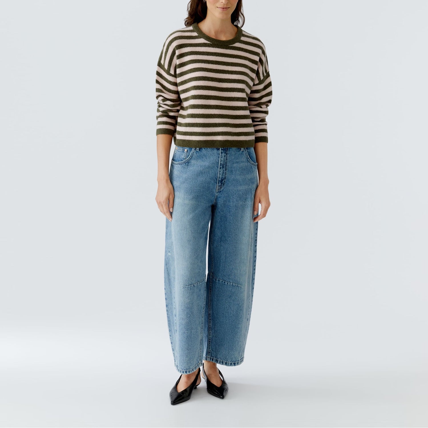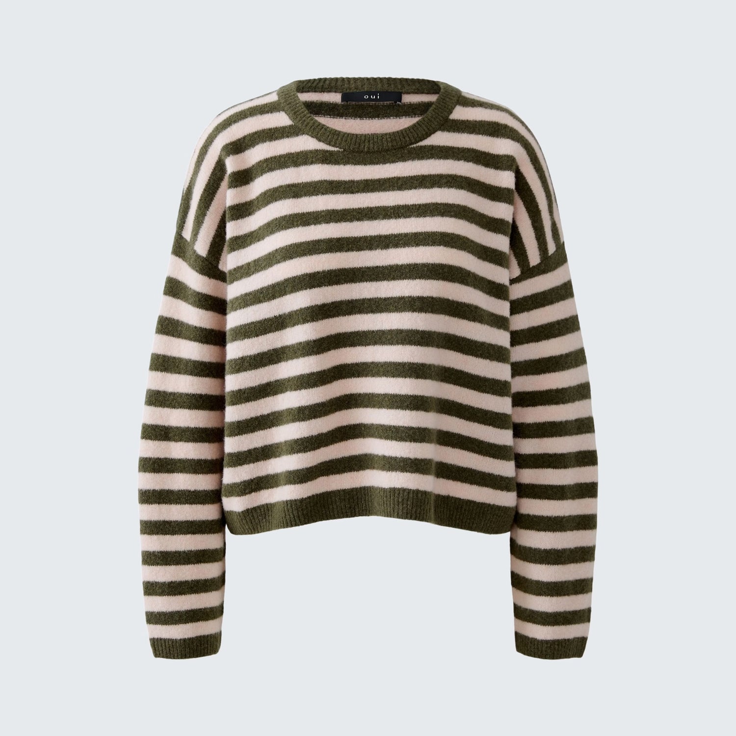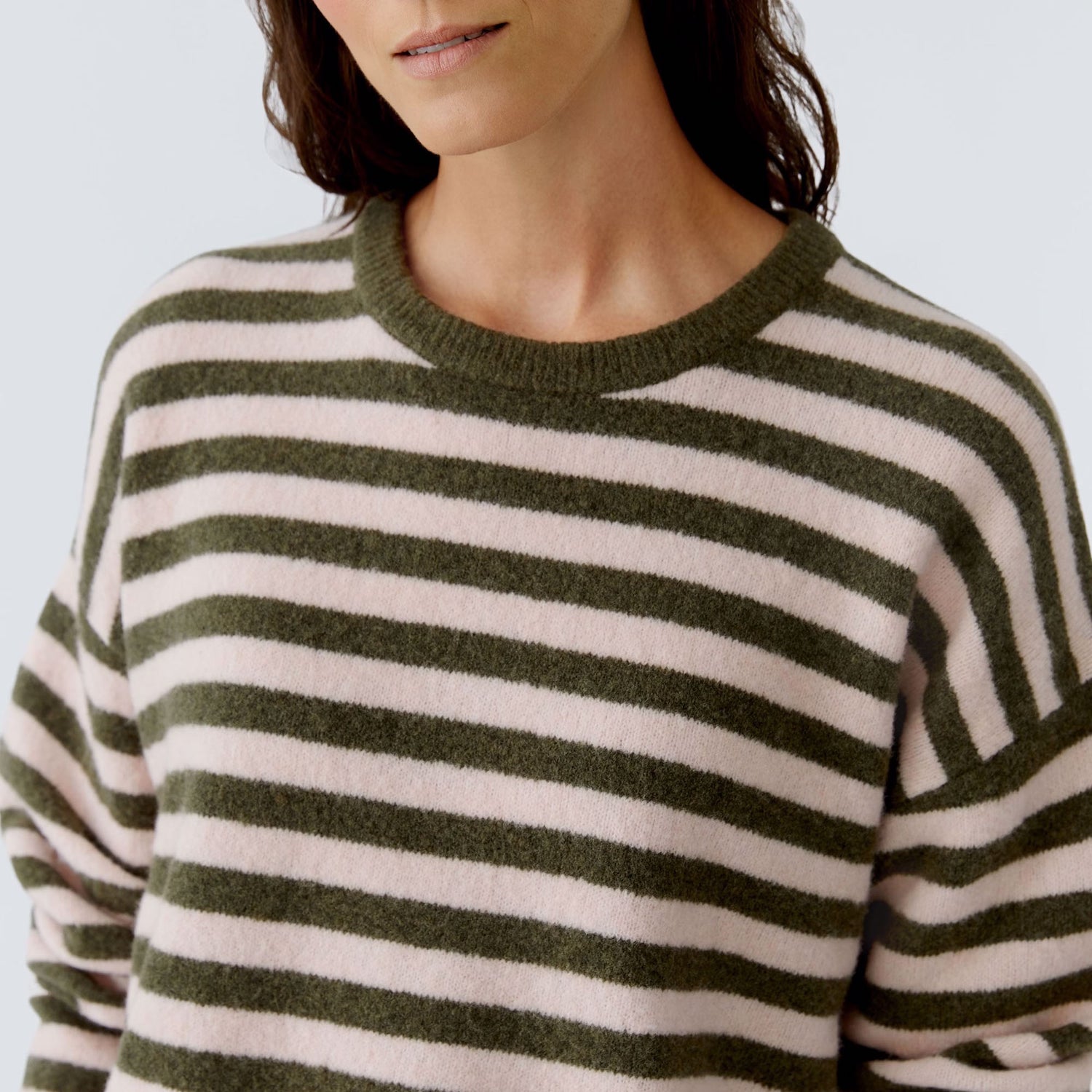 Ultra-soft striped pullover in a modern, fashion-forward silhouette... oversized with a distinctly cropped fit. Knitted from a super cuddly wool-blend yarn in bold stripes. Features a round neckline with double-knit detailing, dropped shoulders for a relaxed drape, and long sleeves finished with short ribbed cuffs at the sleeves and hem. Cosy, cool, and effortlessly stylish.