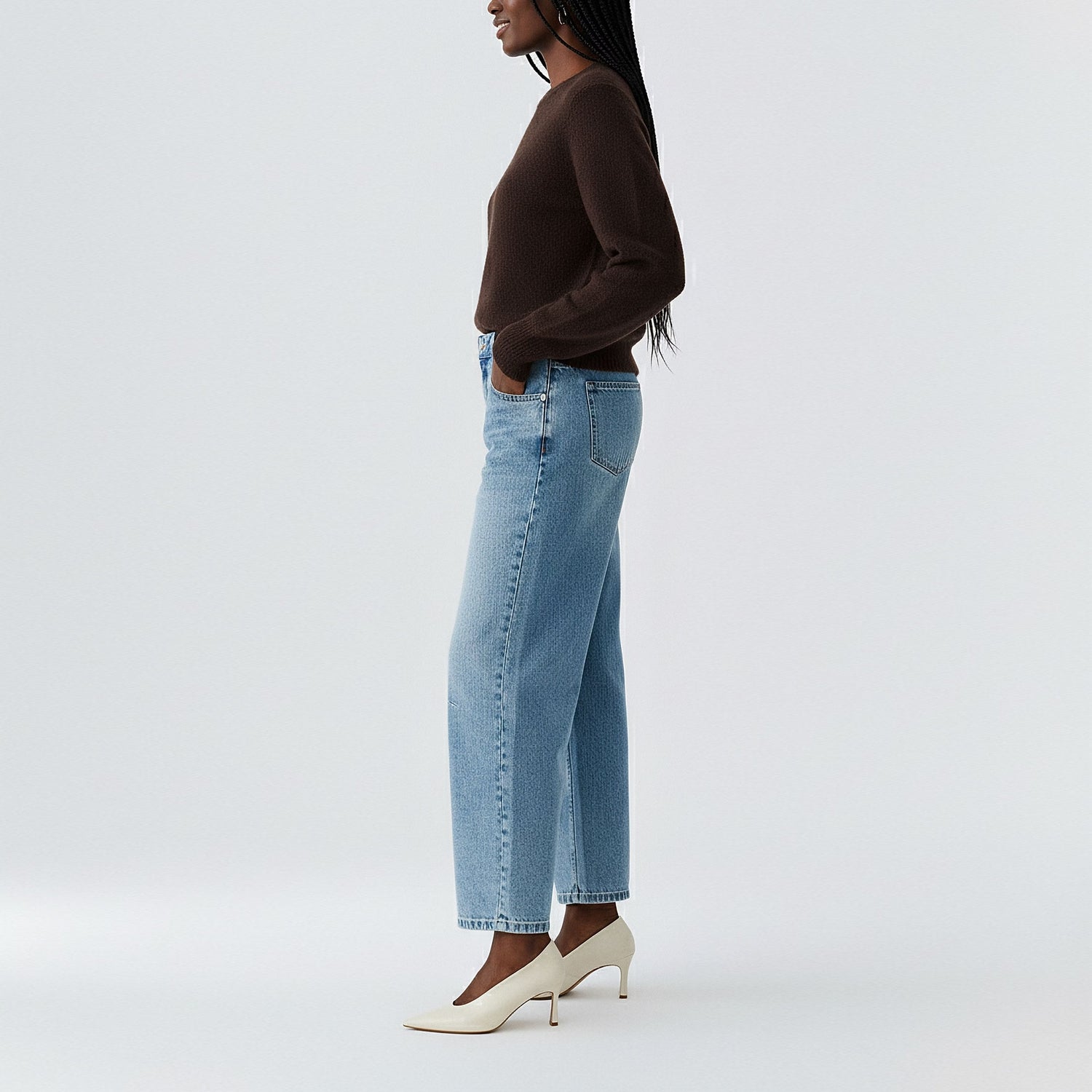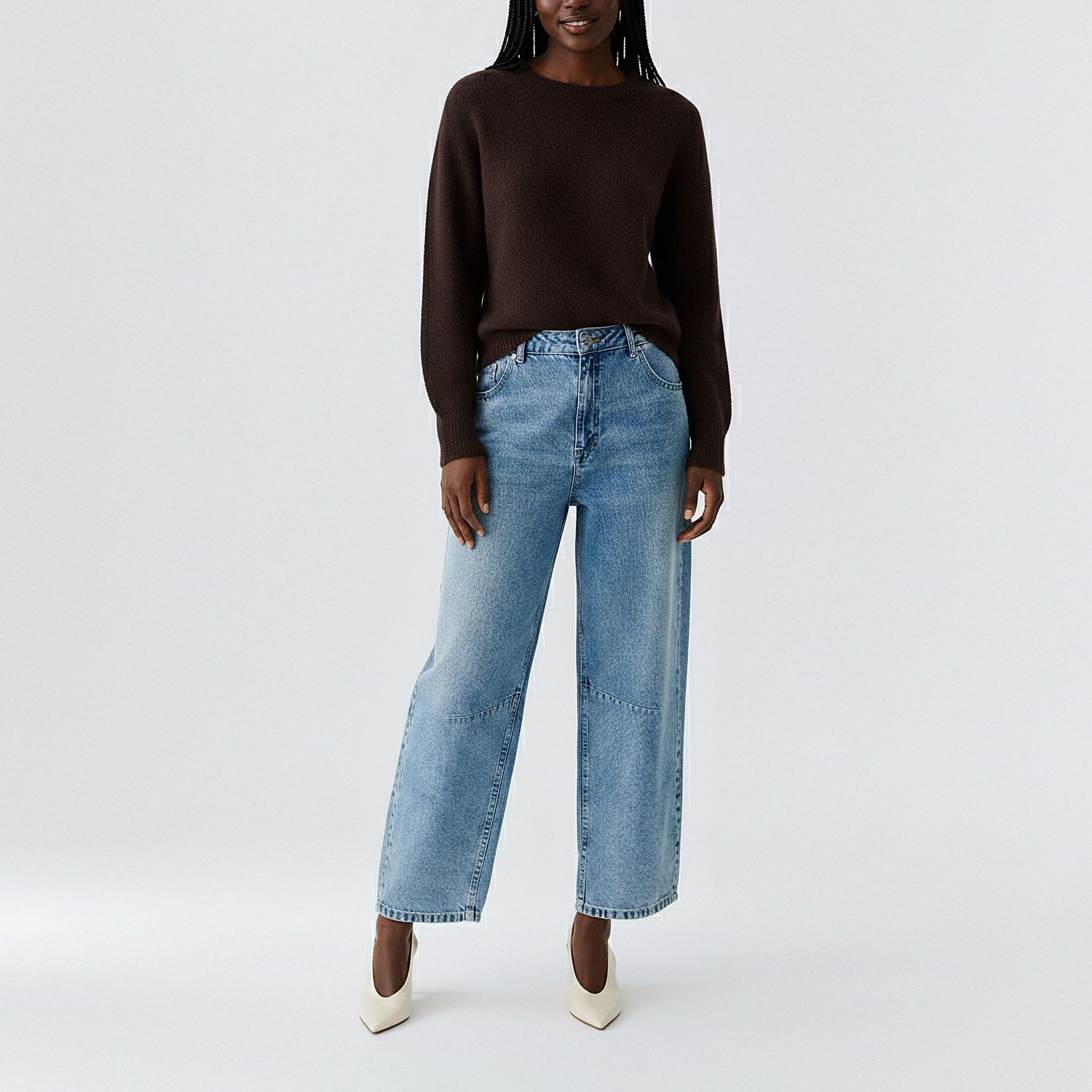 It features a casual cut with a shortened length, a classic round neck and a unique raglan design. The moderate balloon sleeves are finished with cosy knitted cuffs, adding a subtle touch of volume.