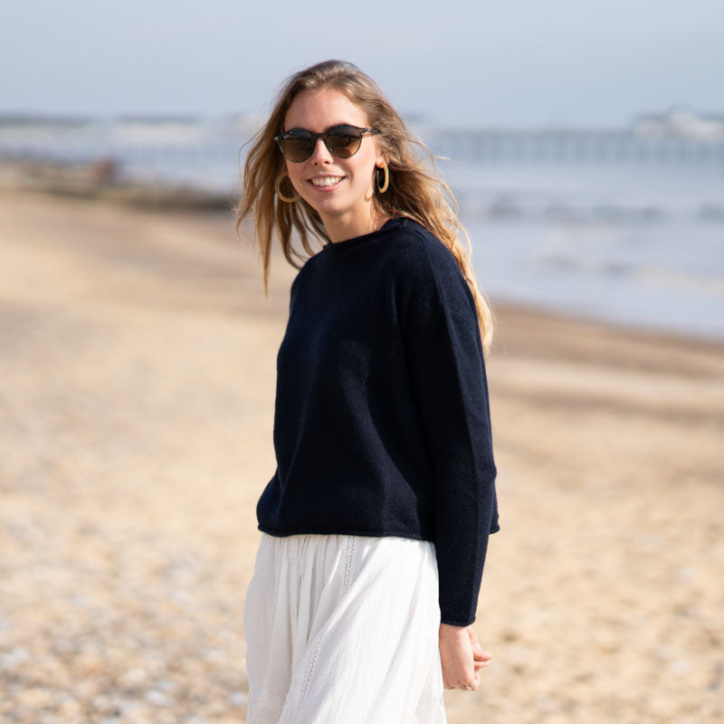 The Pea 100% Cashmere Crop Knit in Navy is the ultimate in luxury and comfort. Made from soft, high-quality cashmere, it offers warmth and softness with a chic, cropped design. The classic navy colour makes it easy to pair with anything, while the crop style adds a modern twist.