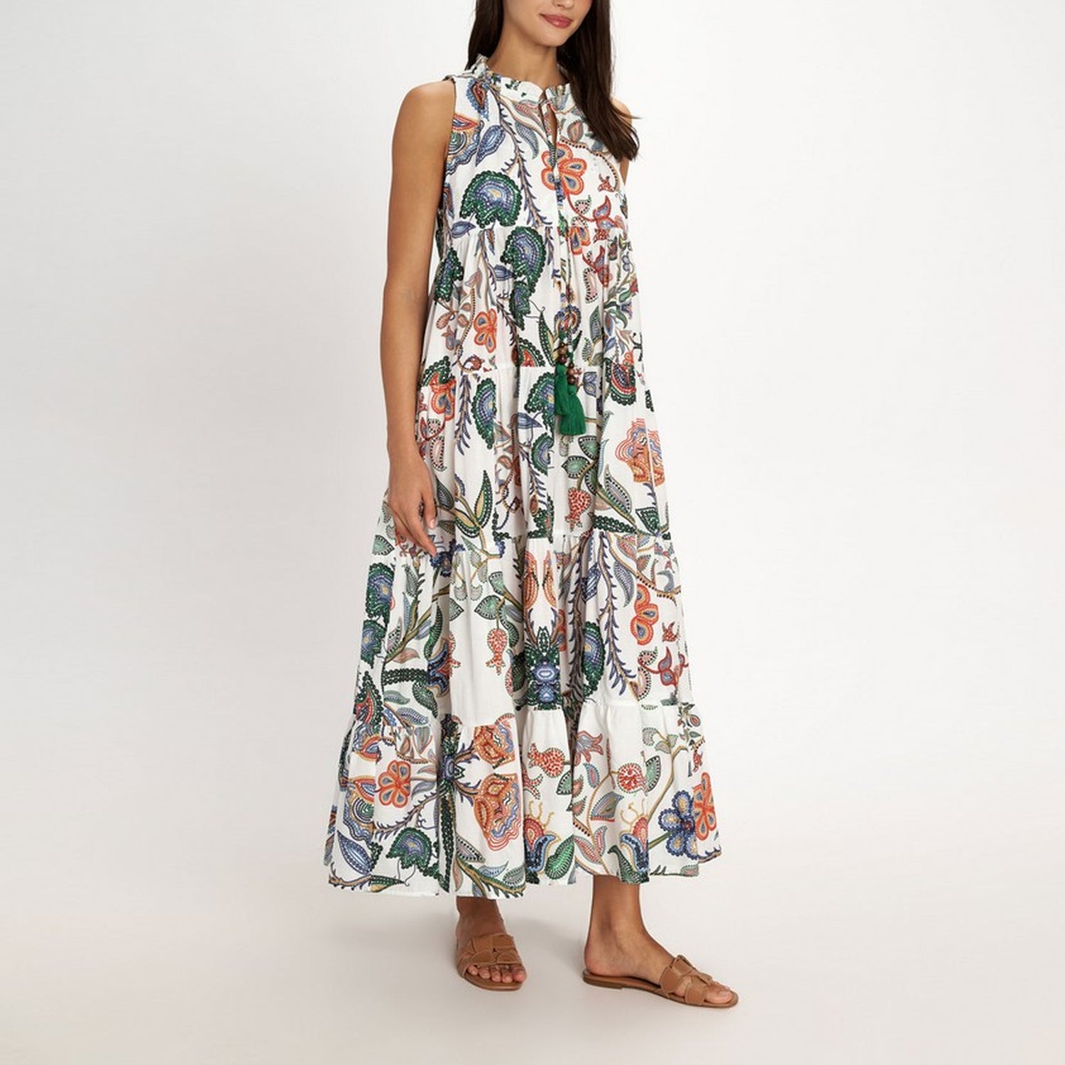 A sleeveless maxi dress in vibrant multi tones, featuring a sort of ruffle collar, stunning high neck, and delicate botanical broderie. Lightweight and elegant, it’s a chic, standout option for summer and holiday occasions.