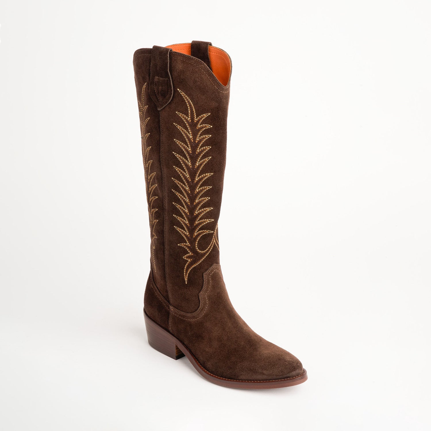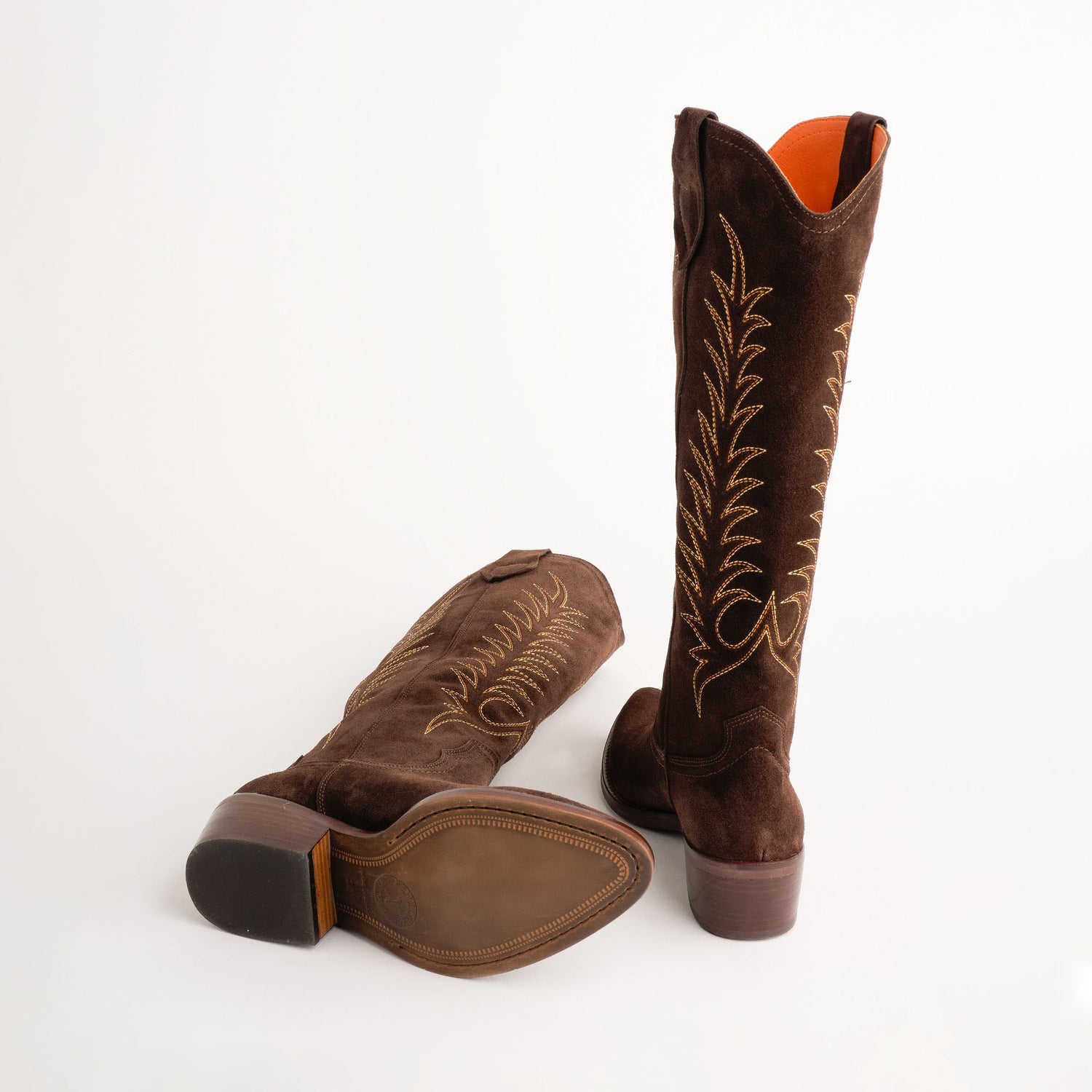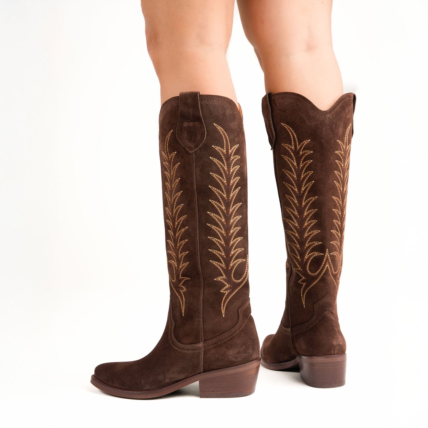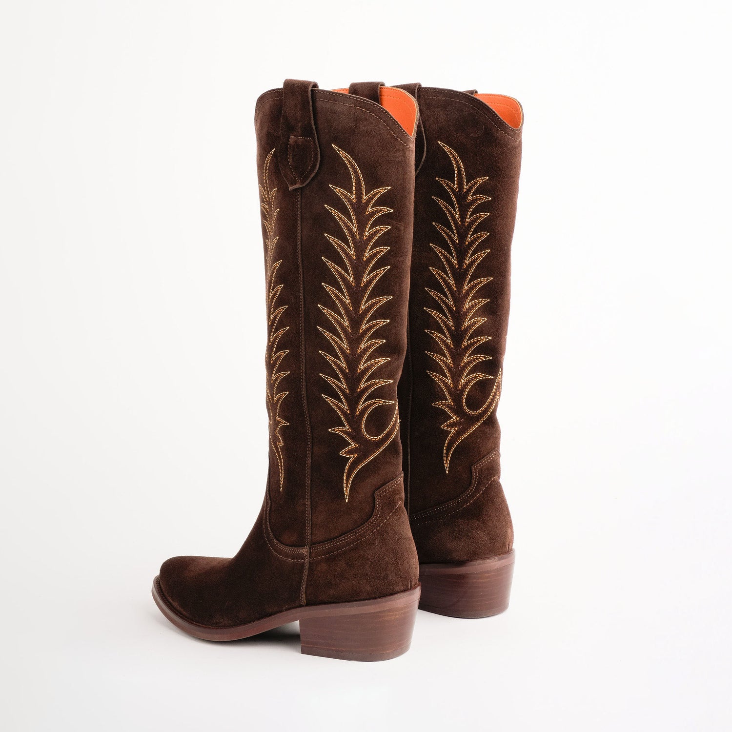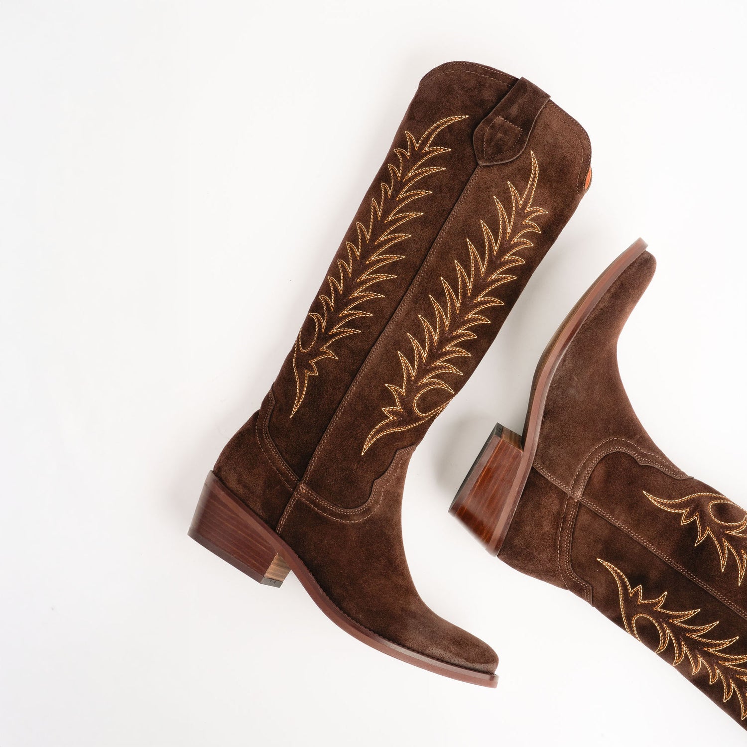 A staff favourite and all-season standout, the Blanca Cowboy Boot brings modern edge to a timeless Western silhouette. Featuring a flattering tall shaft, classic Cuban heel, and signature feather-inspired embroidery, it’s the kind of boot you’ll reach for on repeat. Now introduced in rich chocolate brown suede for the autumn-winter season, each pair is expertly crafted in Spain using LWG gold-rated suede—guaranteed to turn heads and built to last.
