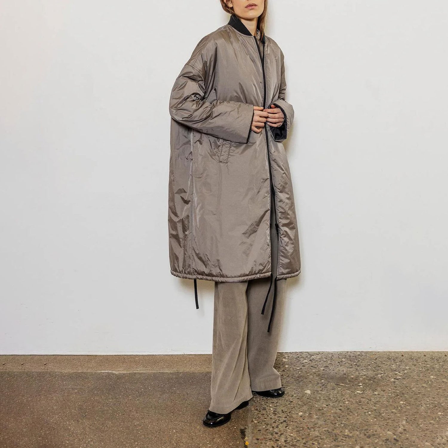 NITA is fully reversible with a contrast-colored inside, offering two looks in one. It features tonal Japanese zippers, ribbed neckline, and functional pockets: one side has sleek zip pockets, while the other has slanted utility-style ones. A drawstring at the hem allows for adjustable shaping.