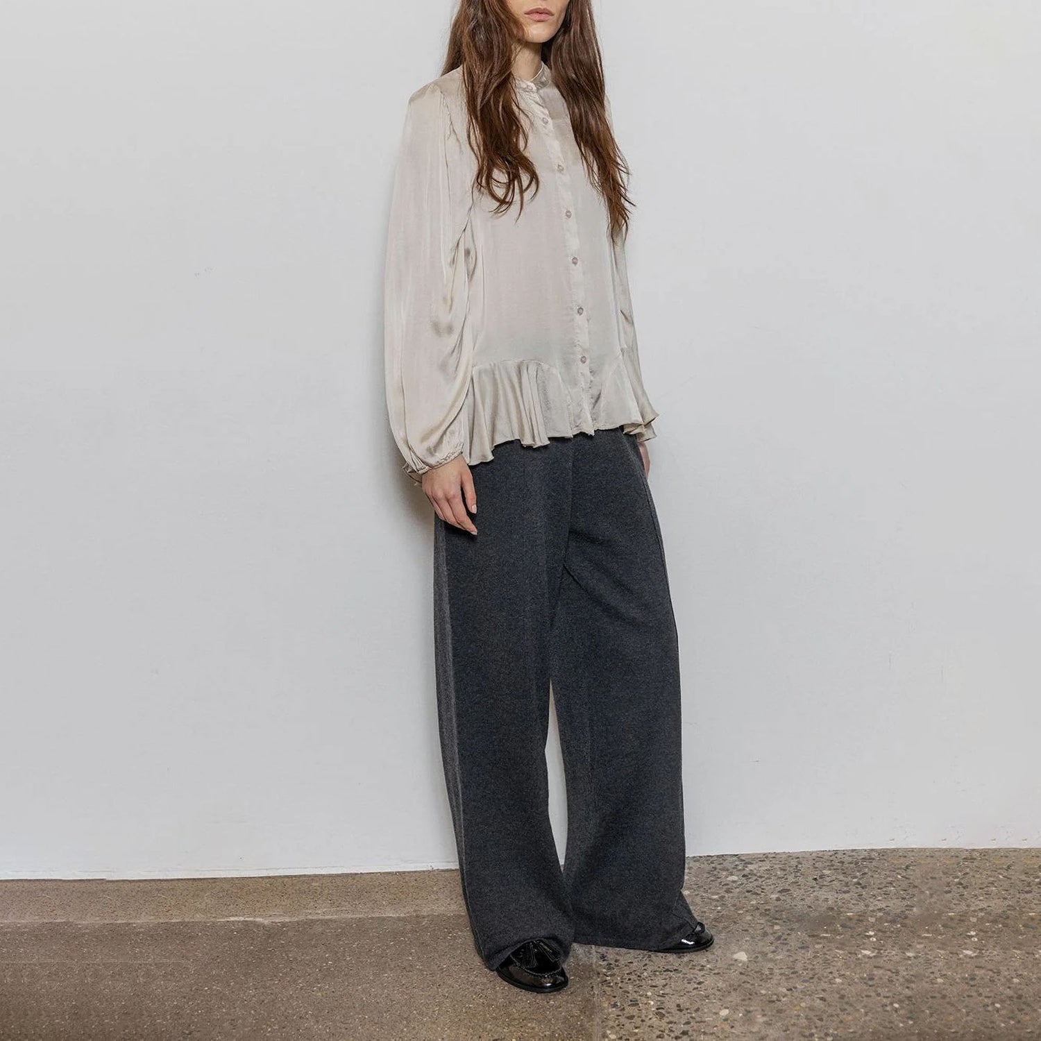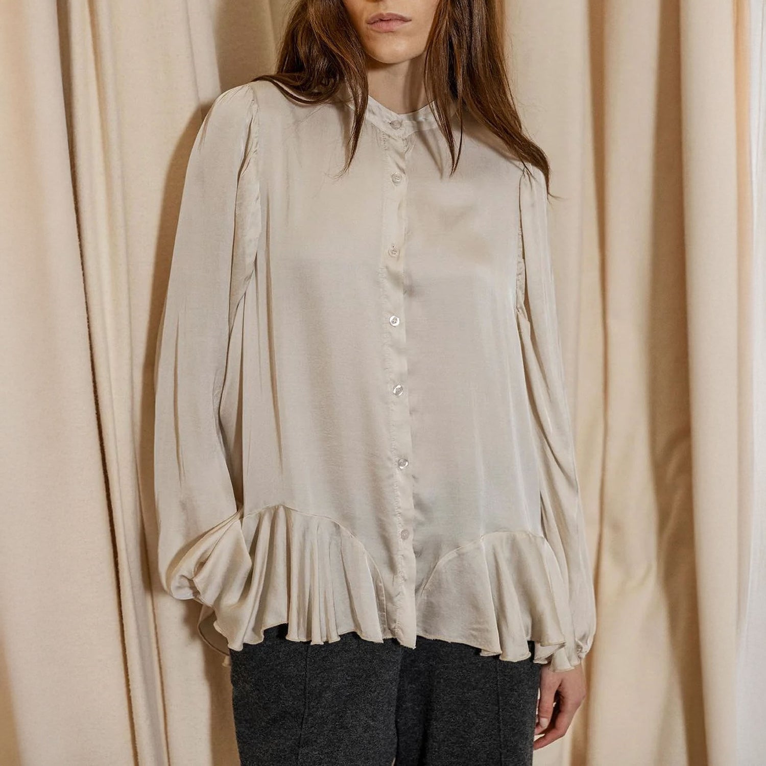 Designed with a gathered peplum hem and flared sleeves finished with elasticated cuffs. The fabric is an Italian viscose-silk blend, garment dyed using a special technique that softens the texture and gives the shirt a relaxed, washed look.