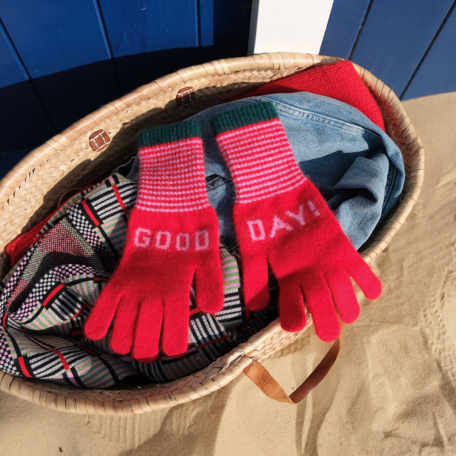 Fluoro pink and letterbox red meet soft moss greens in a fresh, modern palette inspired by coastal light and colour. A contemporary take on Scottish heritage, these gloves are playful yet refined, with bold hues softened by natural fibres.