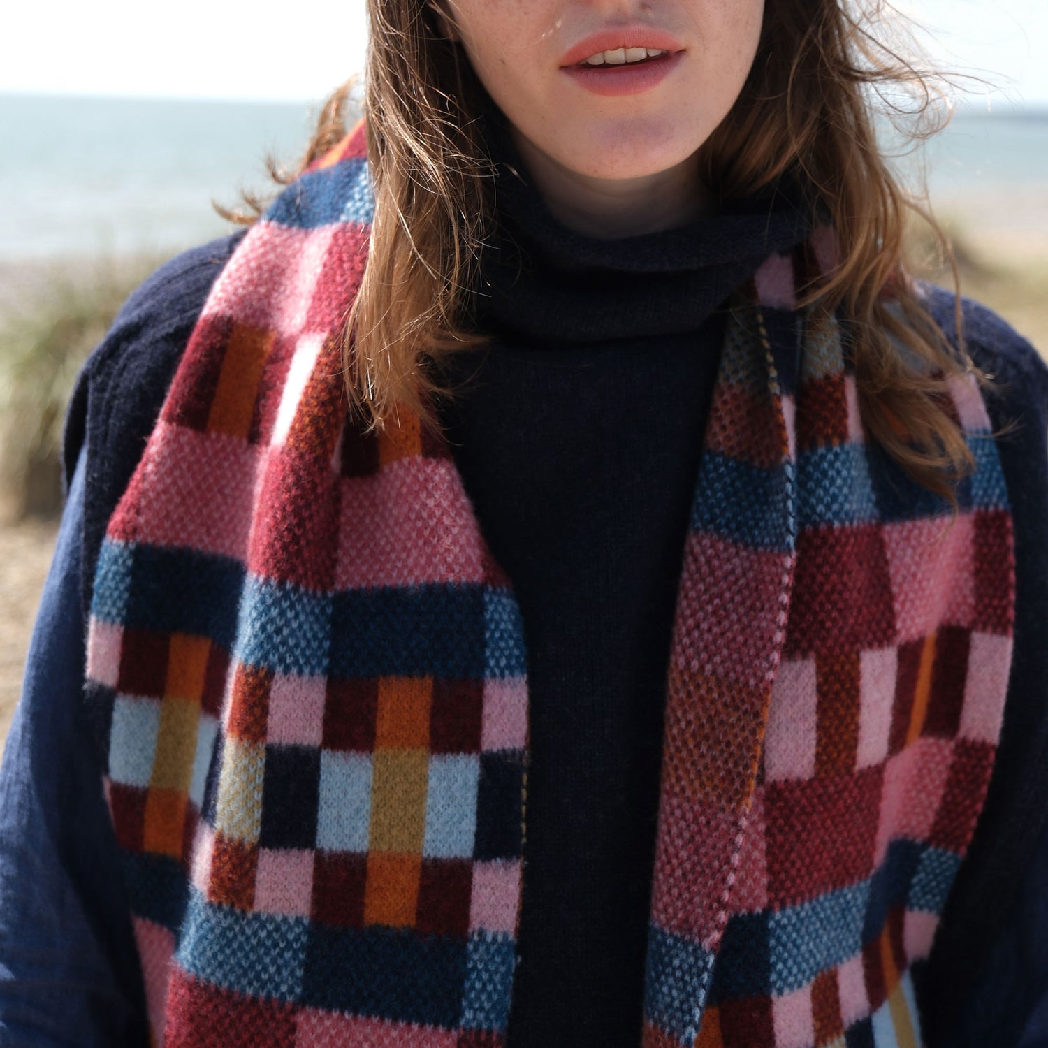 The brushed block scarf is crafted in Scotland from 100% lambswool, offering warmth, softness, and timeless style.