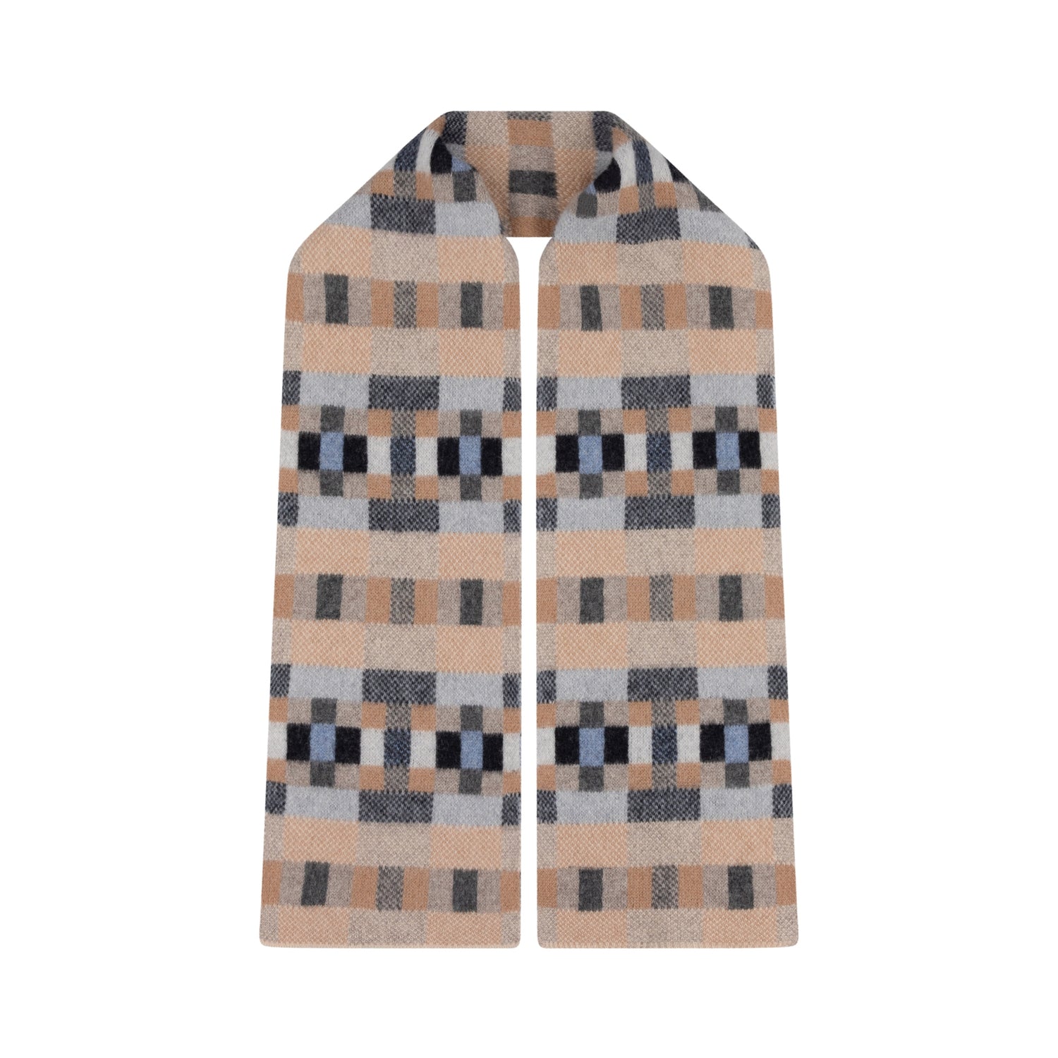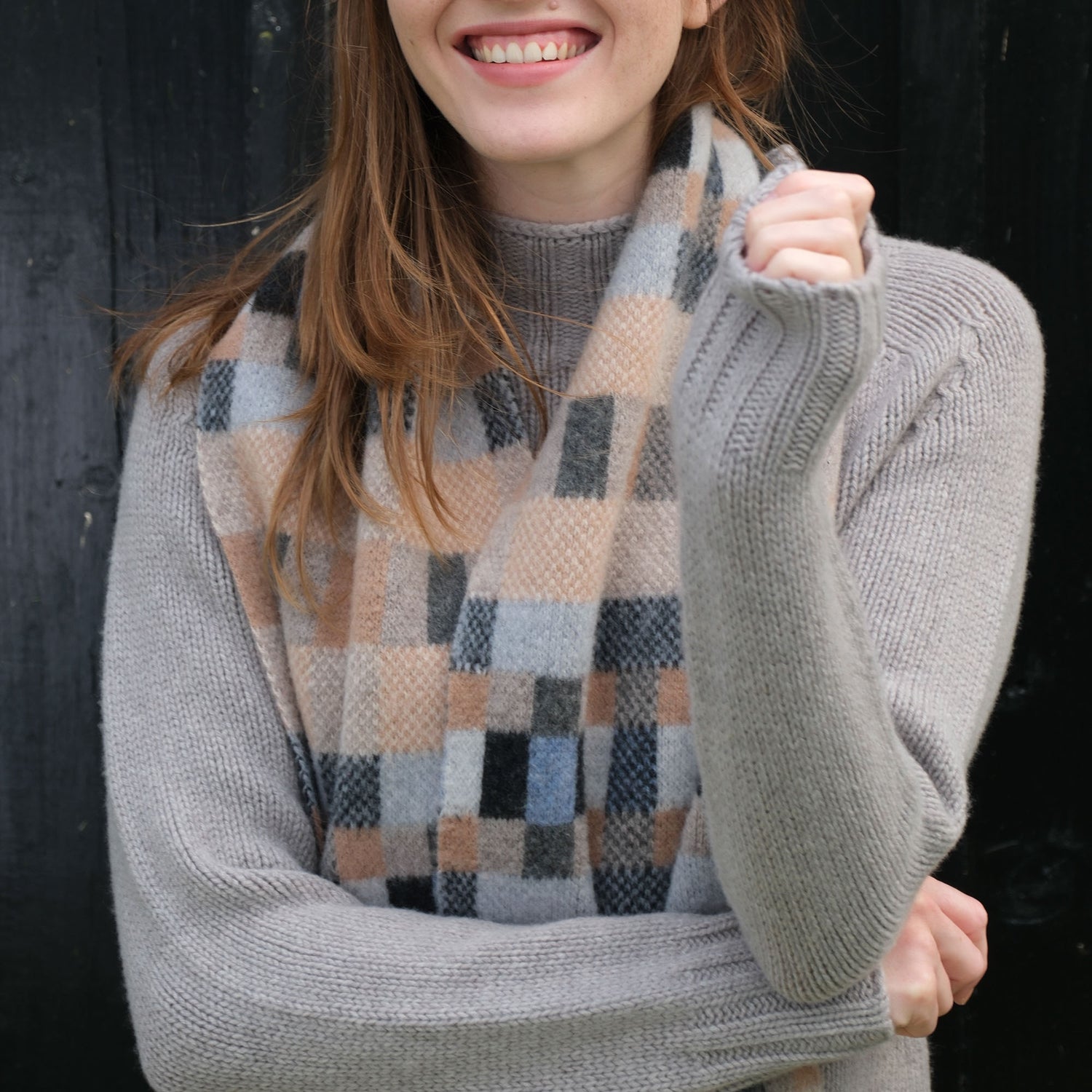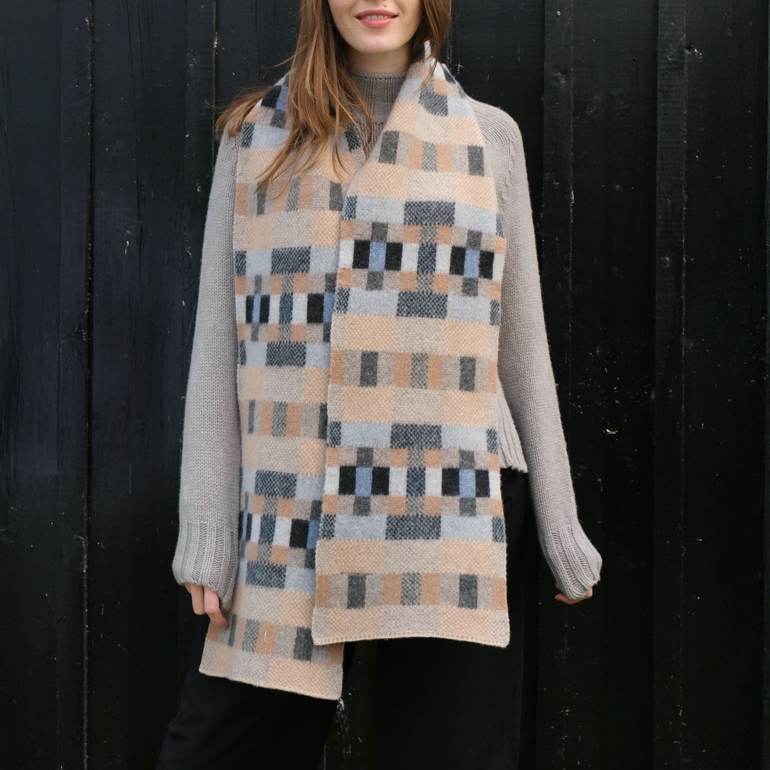Fossil greys paired with dark rum hues create a luxurious, understated look. The brushed block scarf is crafted in Scotland from 100% lambswool, offering warmth, softness, and timeless style.