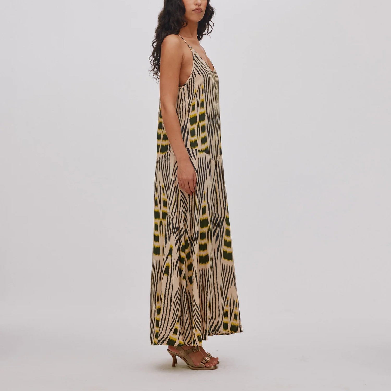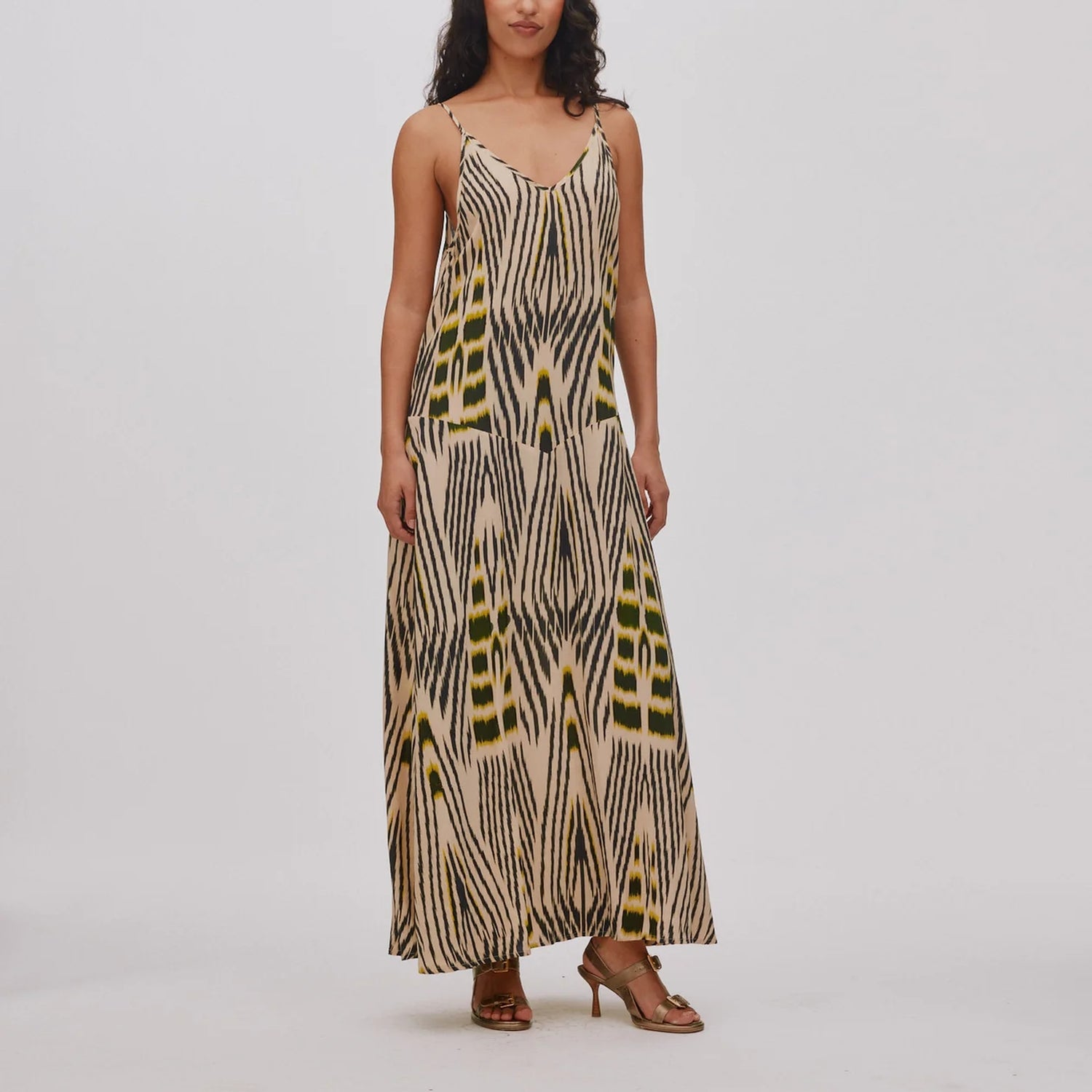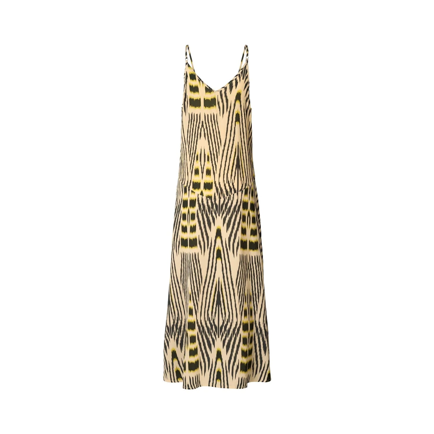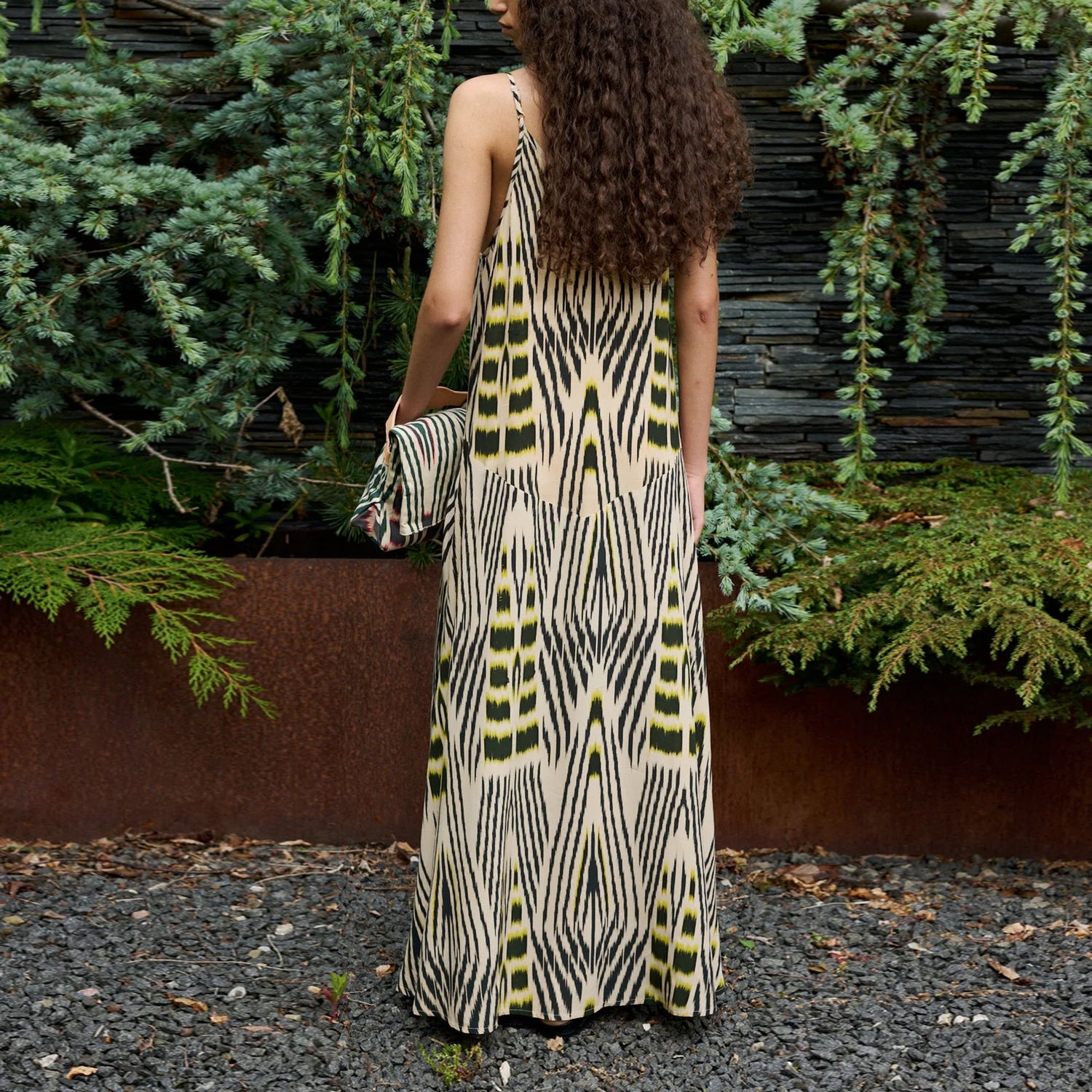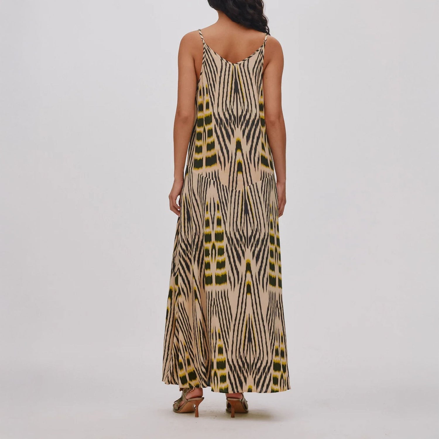This ankle-length dress features a distinctive ikat pattern, hand-dyed in the colour atelier in Bali. Each piece is dyed individually, making every dress truly one of a kind.