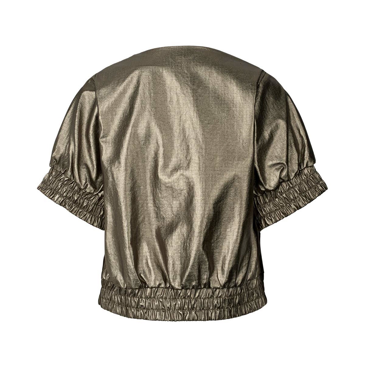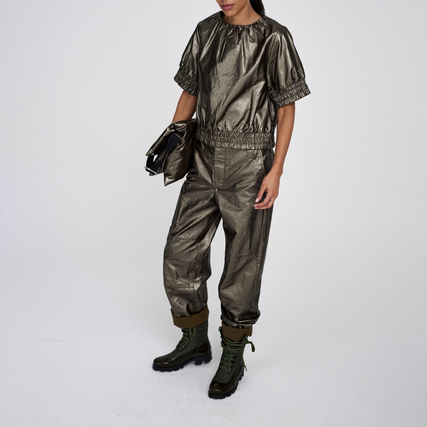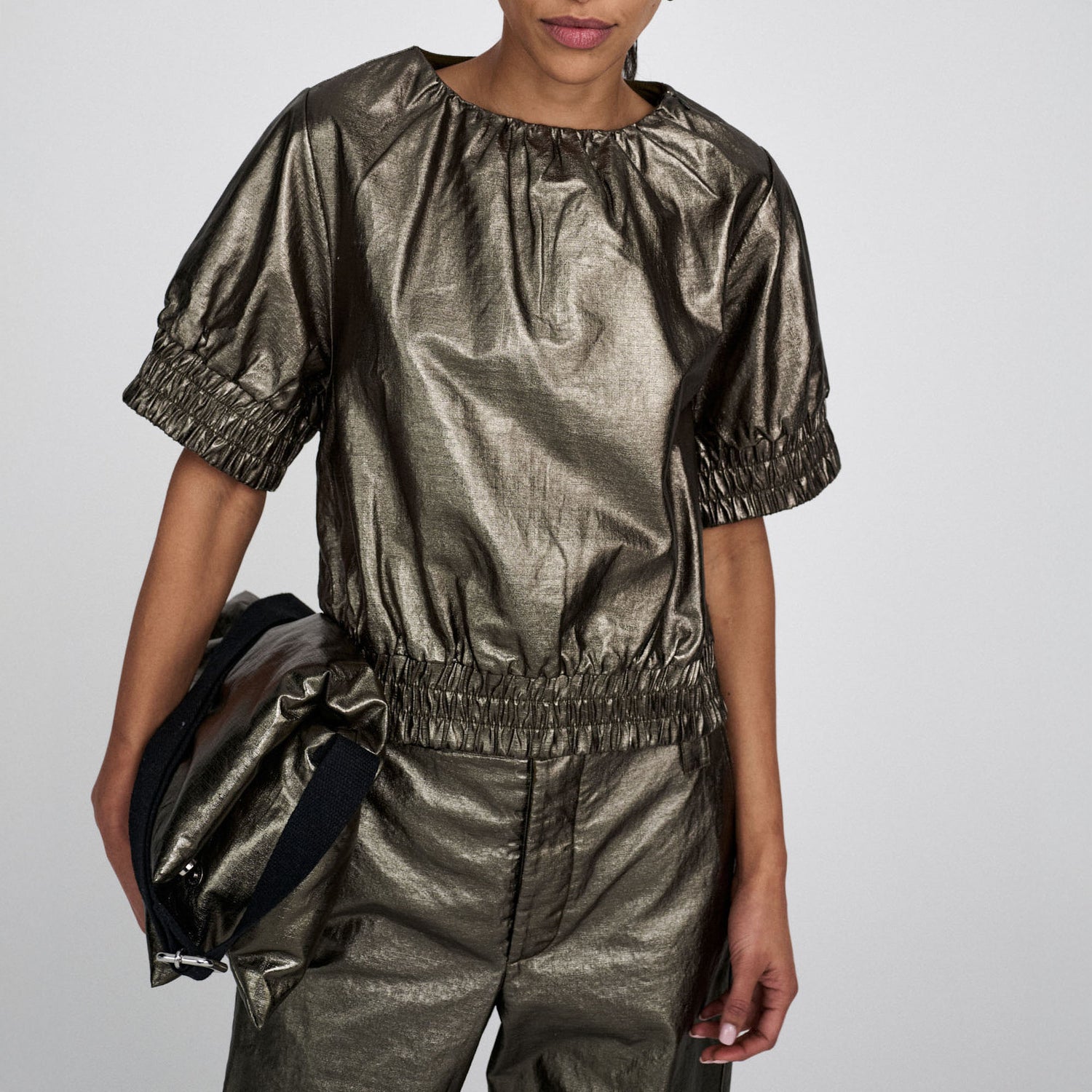 RABENS SALONER Foiled Ripstop Gathered Top in Metallic Olive