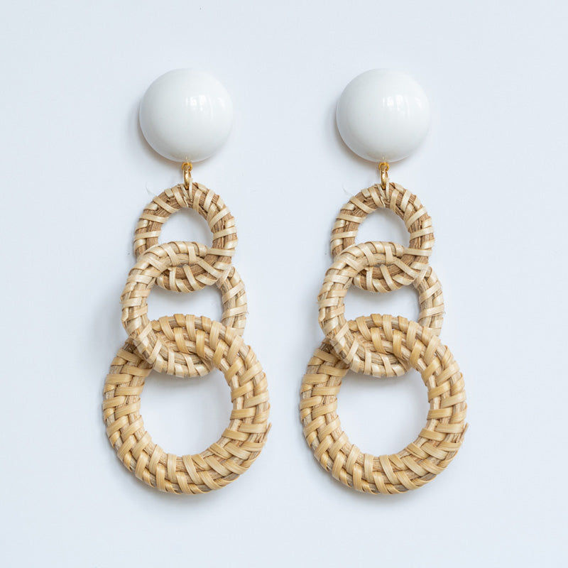 These stunning raffia and white earrings combine natural elegance with a crisp, fresh look. The perfect accessory to add a touch of sophistication and charm to any outfit.