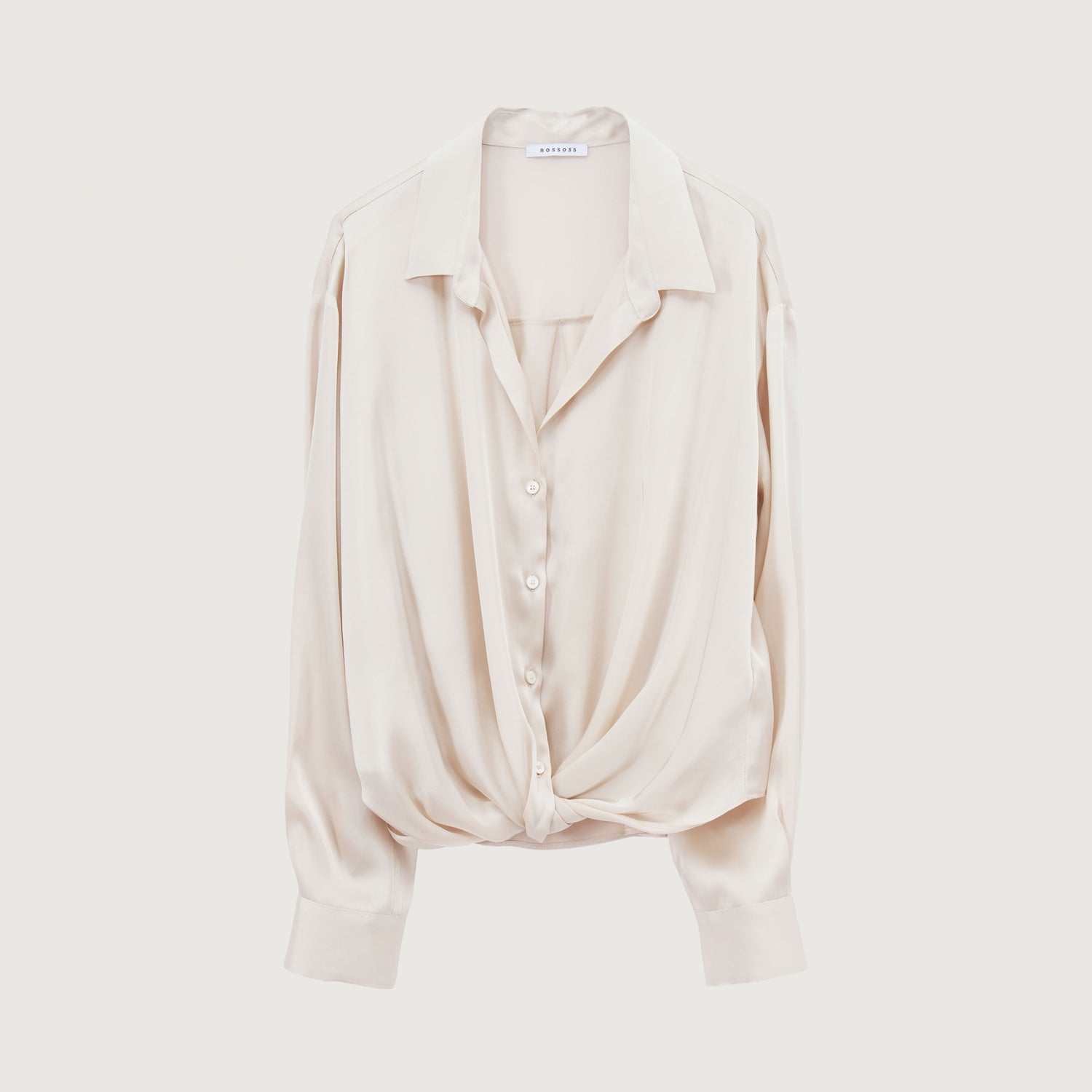 Elegant and versatile, this shirt is crafted from luxurious silk in a soft oatmeal tone. Designed with a flattering waist knot detail, it effortlessly blends sophistication with ease. Perfect to dress up or down, making it a timeless addition to any wardrobe.
